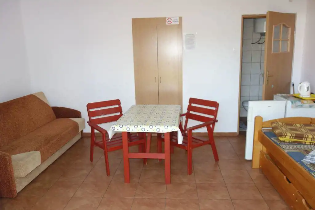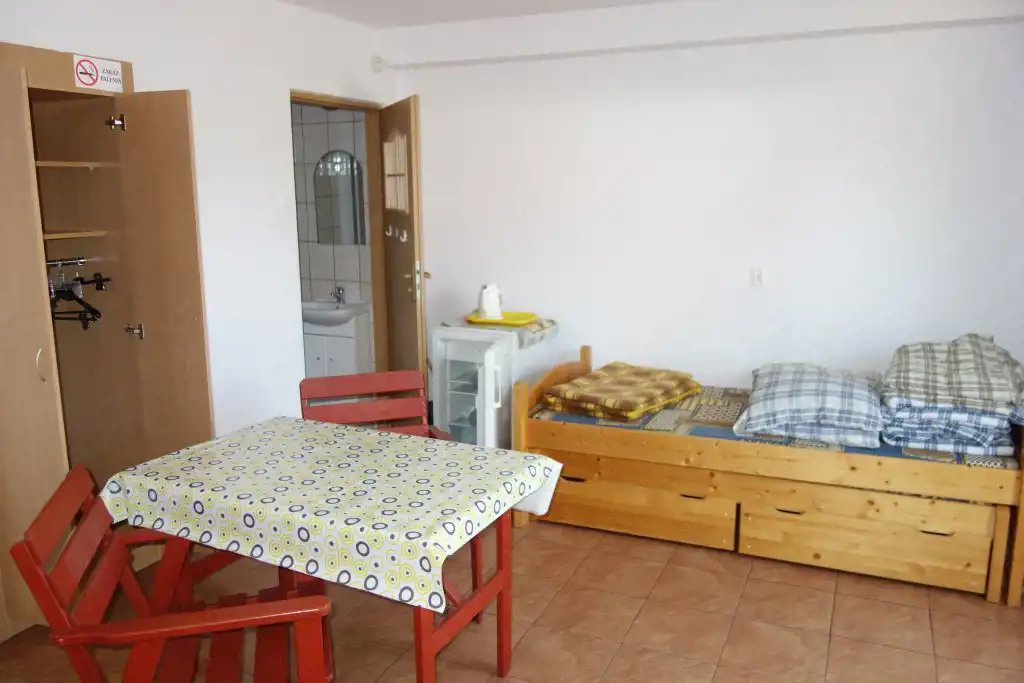 Wyposażenie pokoi: 1 wersalka, 2 pojedyncze łóżka, drewniany stół, 2