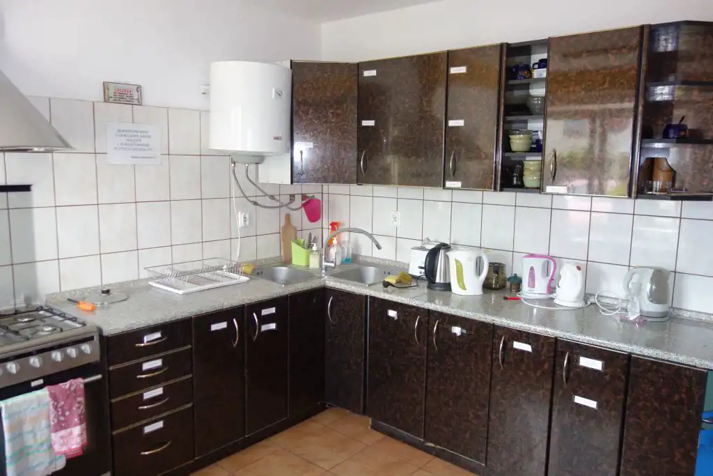Duża kuchnia ogólnie dostępna dla pensjonariuszy, wyposażona w : kuchenkę mikrofalową, dwie