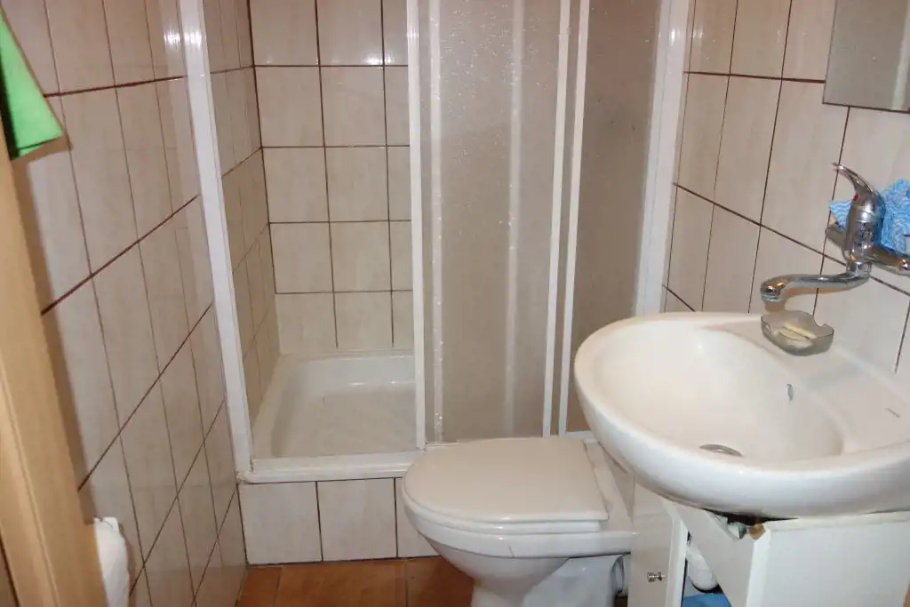 Wyposażenie łazienki: natrysk z brodzikiem, wc, umywalka, lustro.