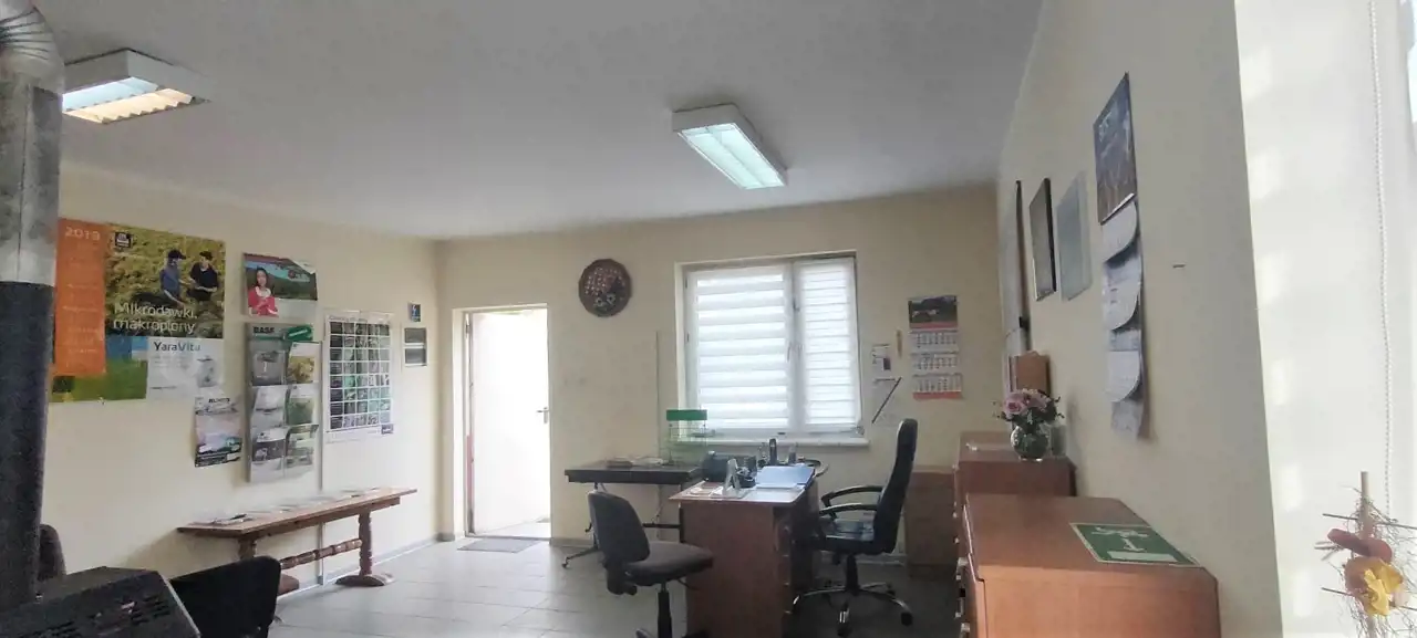 Budynek wykonany z cegły w bardzo dobrym stanie. Infrastruktura mediów: woda, energia elektryczna ( pełne oświetlenie magazynów i powierzchni biurowej), kanalizacja. Ogrzewanie kominkowe. Podłoga terakota. w części biurowej, która jest do użytkowania od zaraz. Możliwość podłączenia gazu.