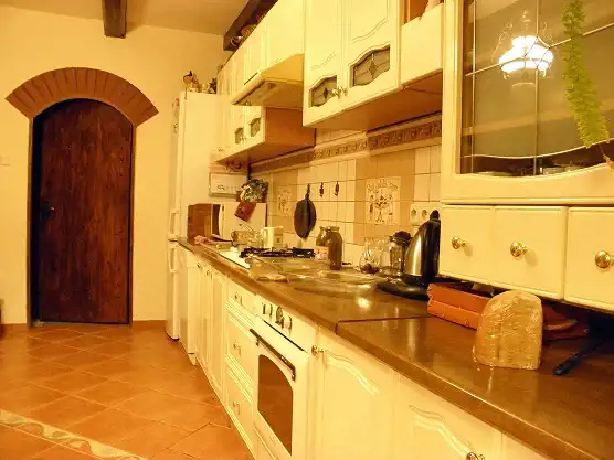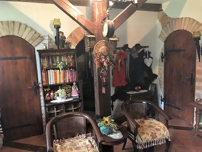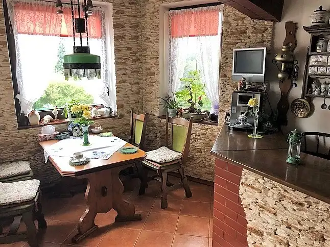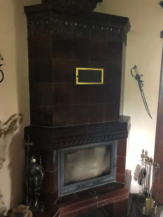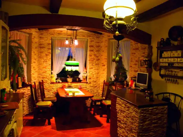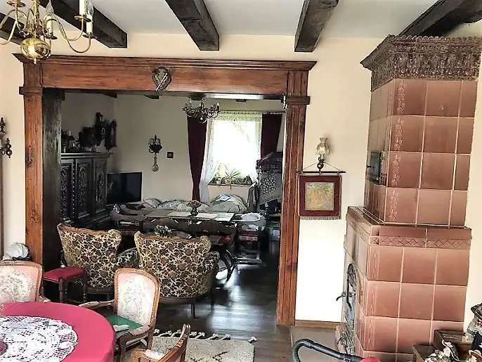 Dom wykończono w stylu wiejskiej rezydencji stąd występują zdobienia drewniane, oryginalne kominki, które stanowią główne ogrzewanie, jeden z płaszczem wodnym do podgrzewania wody oraz ogrzewania piętra (grzejniki), drugi z rozprowadzeniem ciepłego powietrza. W okresie kiedy nie grzeje się w kominku woda jest grzana elektrycznymi, przepływowymi podgrzewaczami.