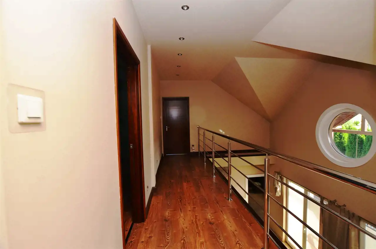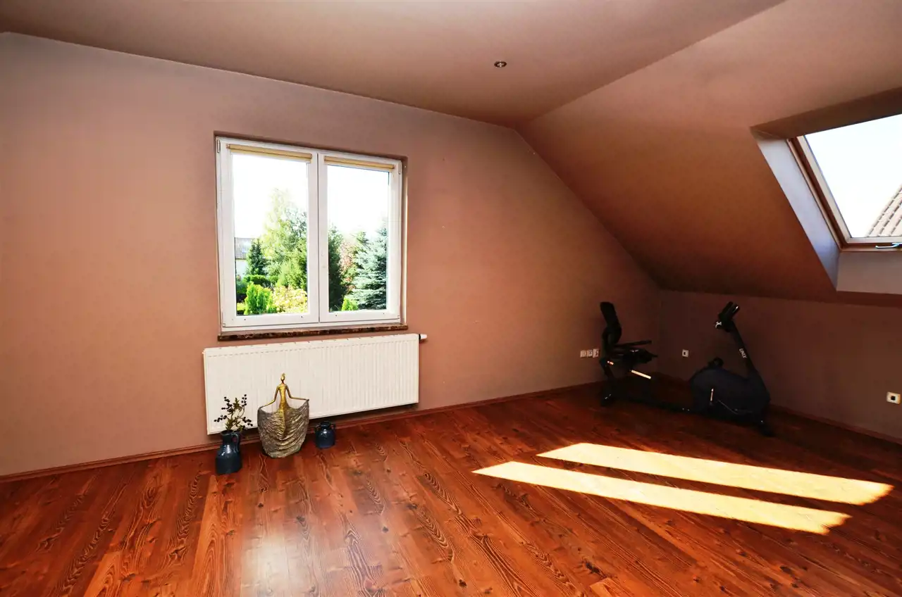 garaż na dwa samochody o pow. ok 40 metrów , bezpośrednie wejście do części mieszkalnej, brama garażowa jak i brama wjazdowa na posesję otwierana pilotem