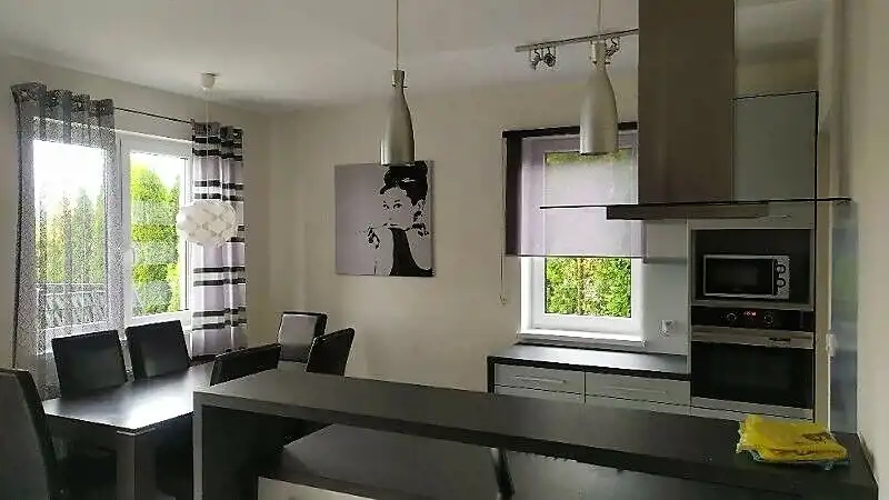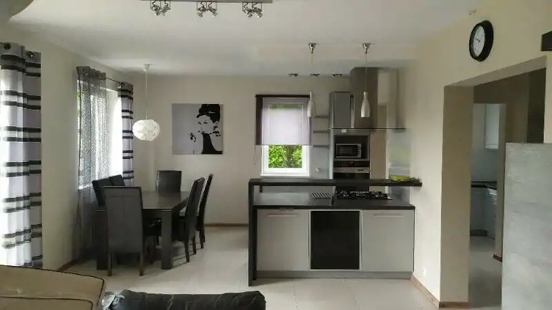 Na parterze zlokalizowana jest otwarta kuchnia, salon, łazienka z kabiną prysznicową oraz garaż. Z salonu jest bezpośrednie wyjście na taras ok 40m2 i zejście do ogrodu. Na piętrze znajdują się 3 sypialnie każda z wyjściem na balkon, garderoba, schowek na rzeczy sezonowe oraz łazienka z prysznicem i wanną. Dom wykończony w 2015 r. na podłodze w kuchni, łazienkach oraz korytarzu płytki, w pokojach panele. Obecnie odświeżone ściany wew. oraz elewacja, balkony wykończone żywicą. Instalacja alarmowa, światłowód na osiedlu, woda miejska.