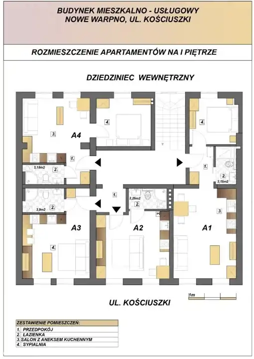 PIĘTRO- apartamenty do wynajmu 2 pokoje z łazienkami o powierzchniach 33,4/38m2 oraz 1 pokojowych o powierzchniach 23,7/22,4m2 z łazienkami.