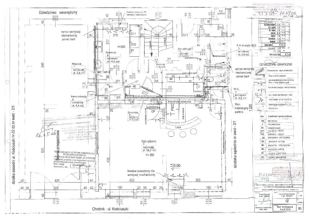 PARTER- lokal z przeznaczeniem na gastronomię składający się z sali sprzedażowej 55m2, zaplecza (kuchnia, magazyn, komunikacja, toalety dla obsługi oraz osobno dla klientów). Możliwość przebudowy na inne cele. Podłogi w tej części z terakoty.