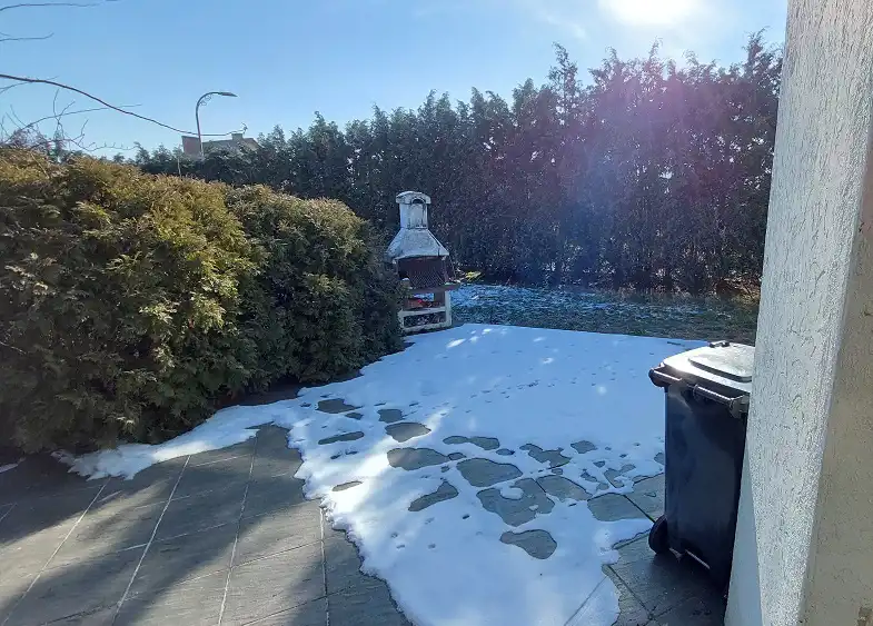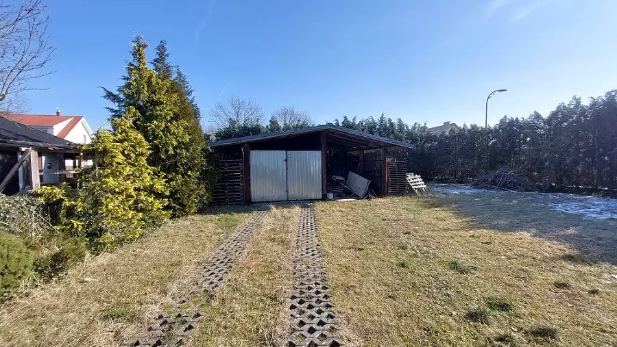 Ogród zagospodarowany z nasadzeniami. W głębi ogrodu wiata w połowie zamknięta (garaż) w połowie otwarta, Druga wiata przy budynku. Taras duży około 30m2 z grillem. Ogrodzenie metalowe. Dojazd asfaltowy.
