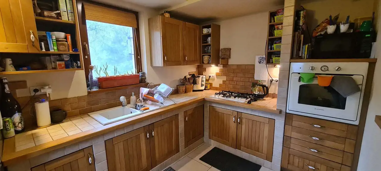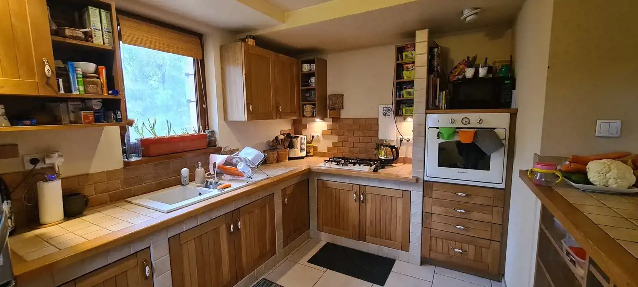 Kuchnia w zabudowie wykonanej z litego drewna wraz ze sprzętem AGD.