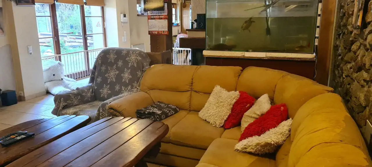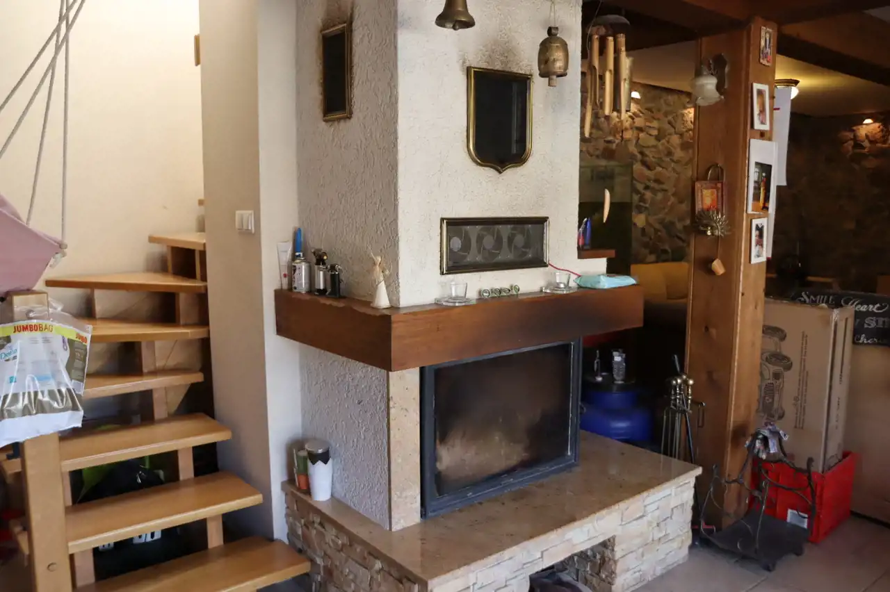 Przed domem znajduje się miejsce do biesiadowania z drewnianymi ławami i murowanym grillem.