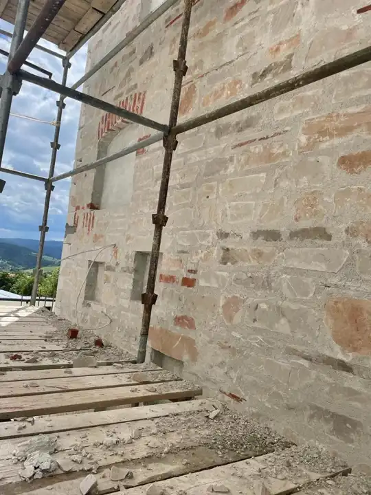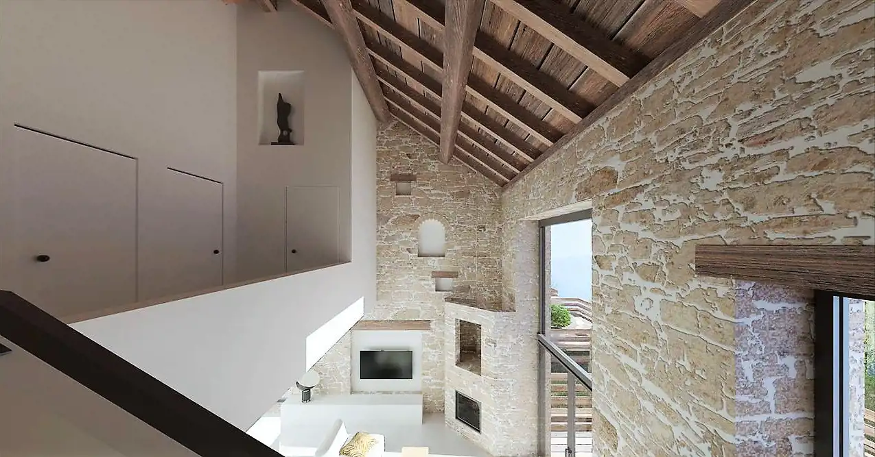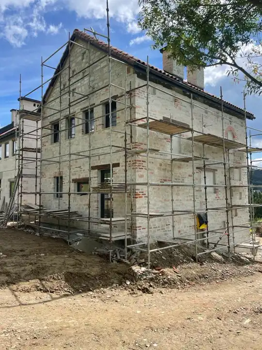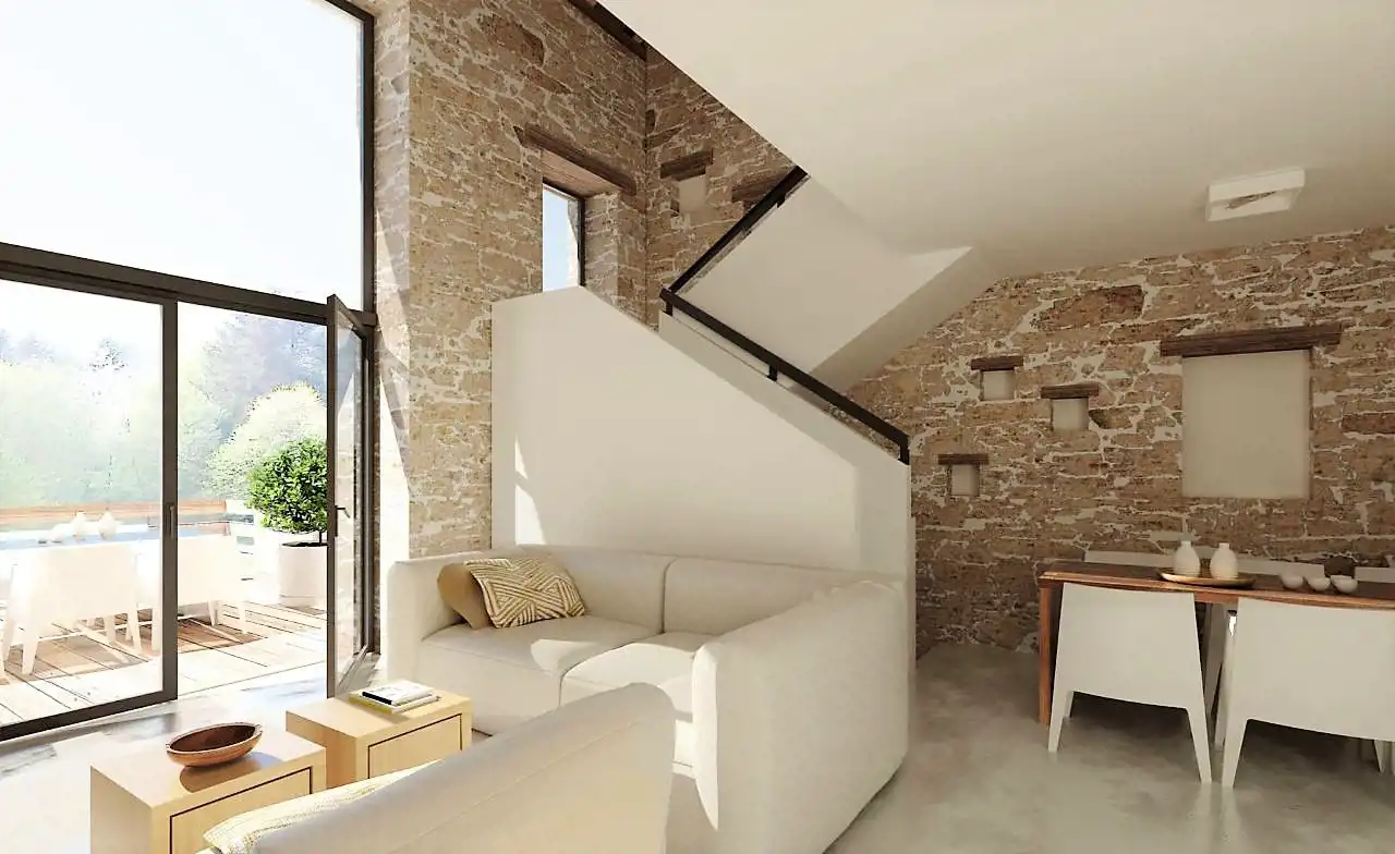 Ściany zewnętrzne wykonane  z kamienia murowanego, naturalnego, cegły tradycyjnej ręcznie formowanej, elementów postarzanego drewna i drewna z odzysku oraz betonu architektonicznego.