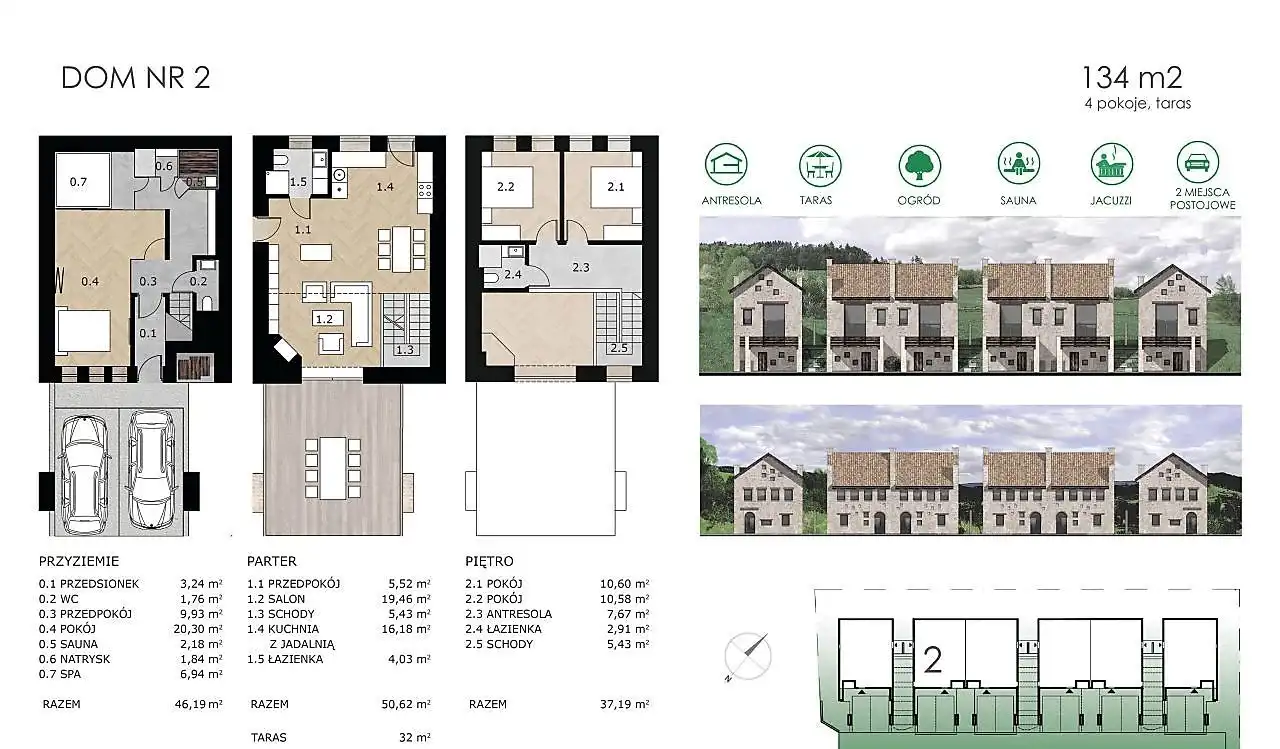 Każdy z domów ma powierzchnię 134 m2, na którą składają się między innymi 3 sypialnie, przestronny salon z aneksem kuchennym oraz SPA z sauną i jacuzzi, 35 metrowy taras pod którym znajdują się dwa miejsca parkingowe.