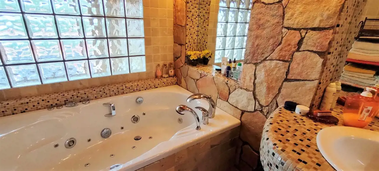 Upstairs: large room - bedroom, bathroom with bathtub and shower - all carefully finished with granite, wood and mosaics. A large balcony and an observation deck providing a phenomenal viewing experience.
