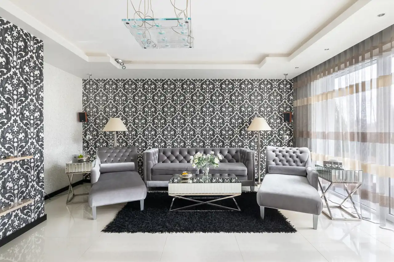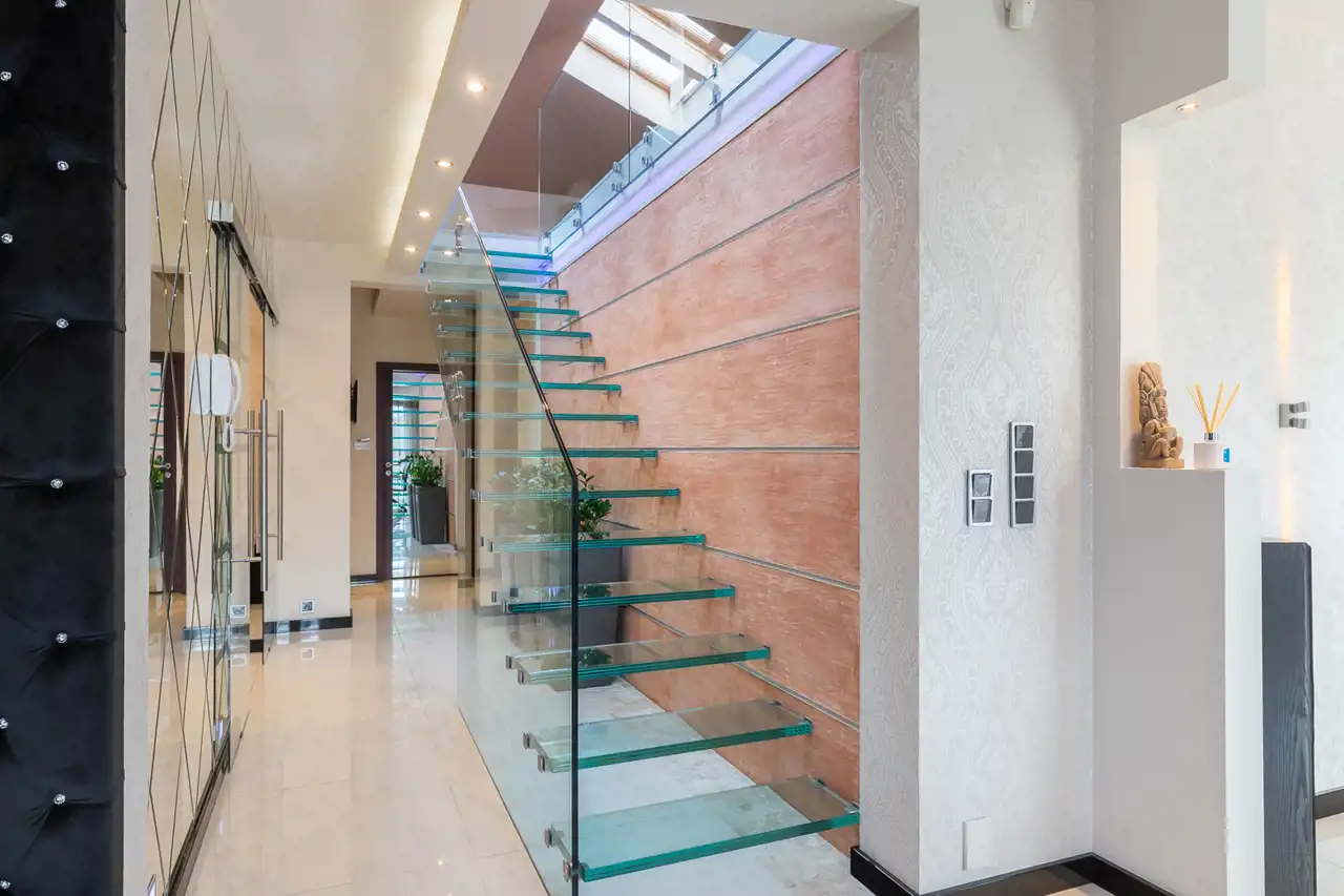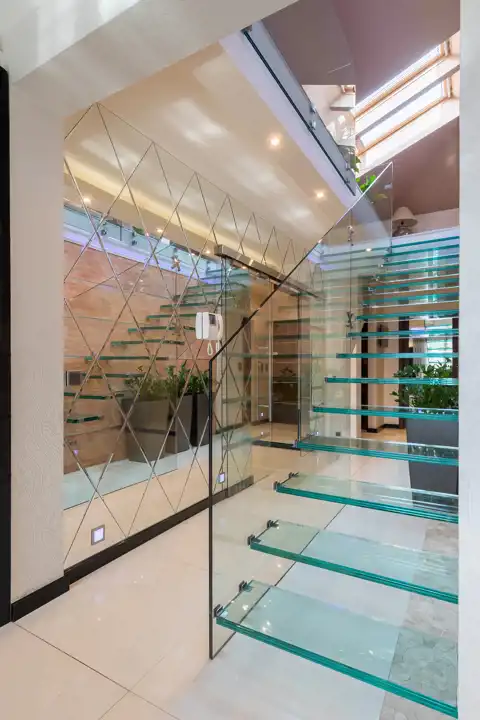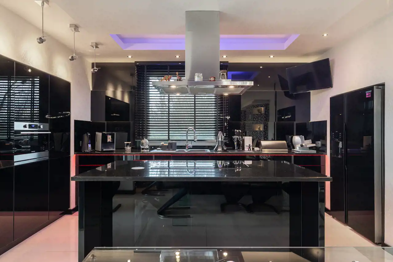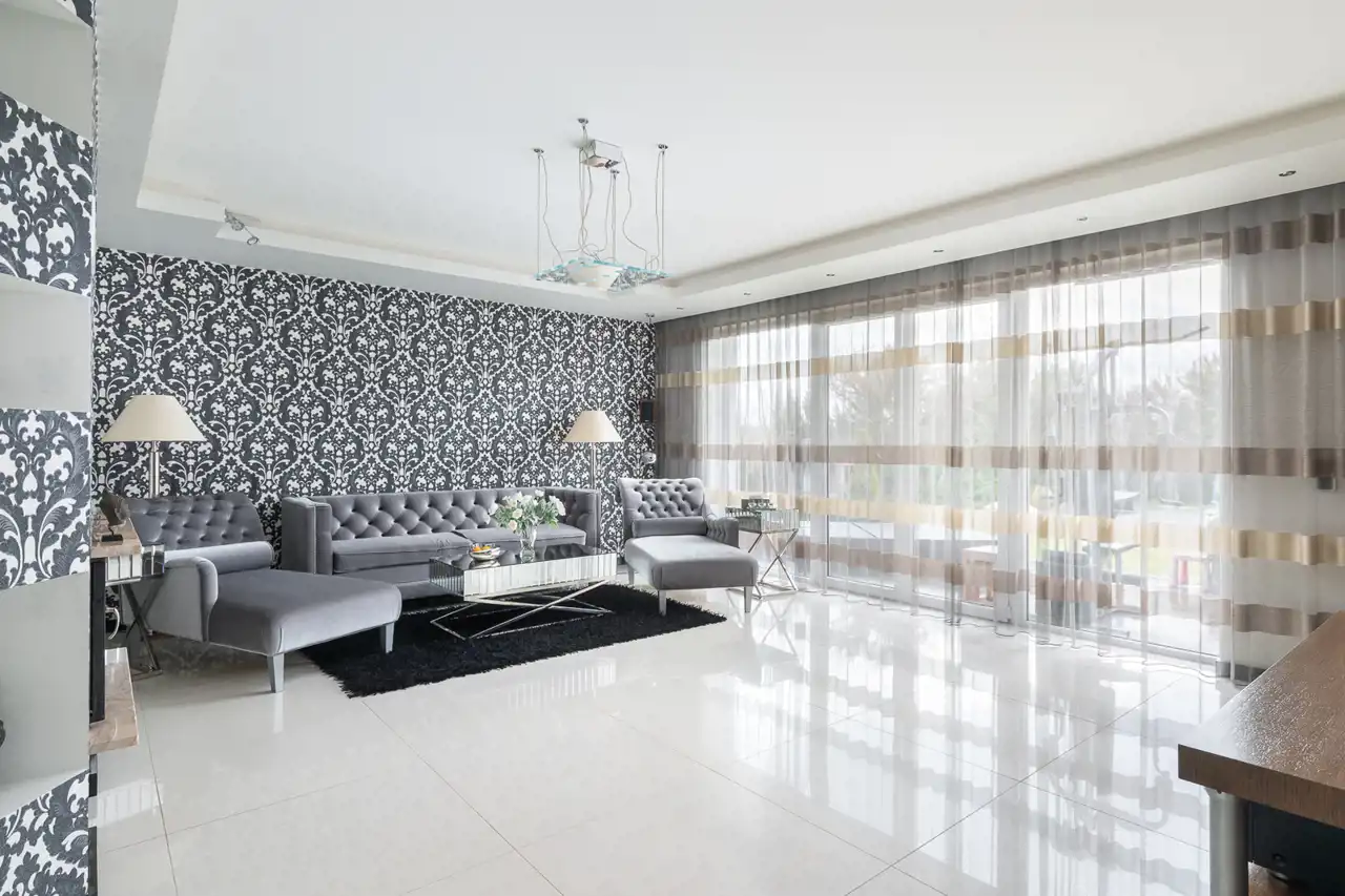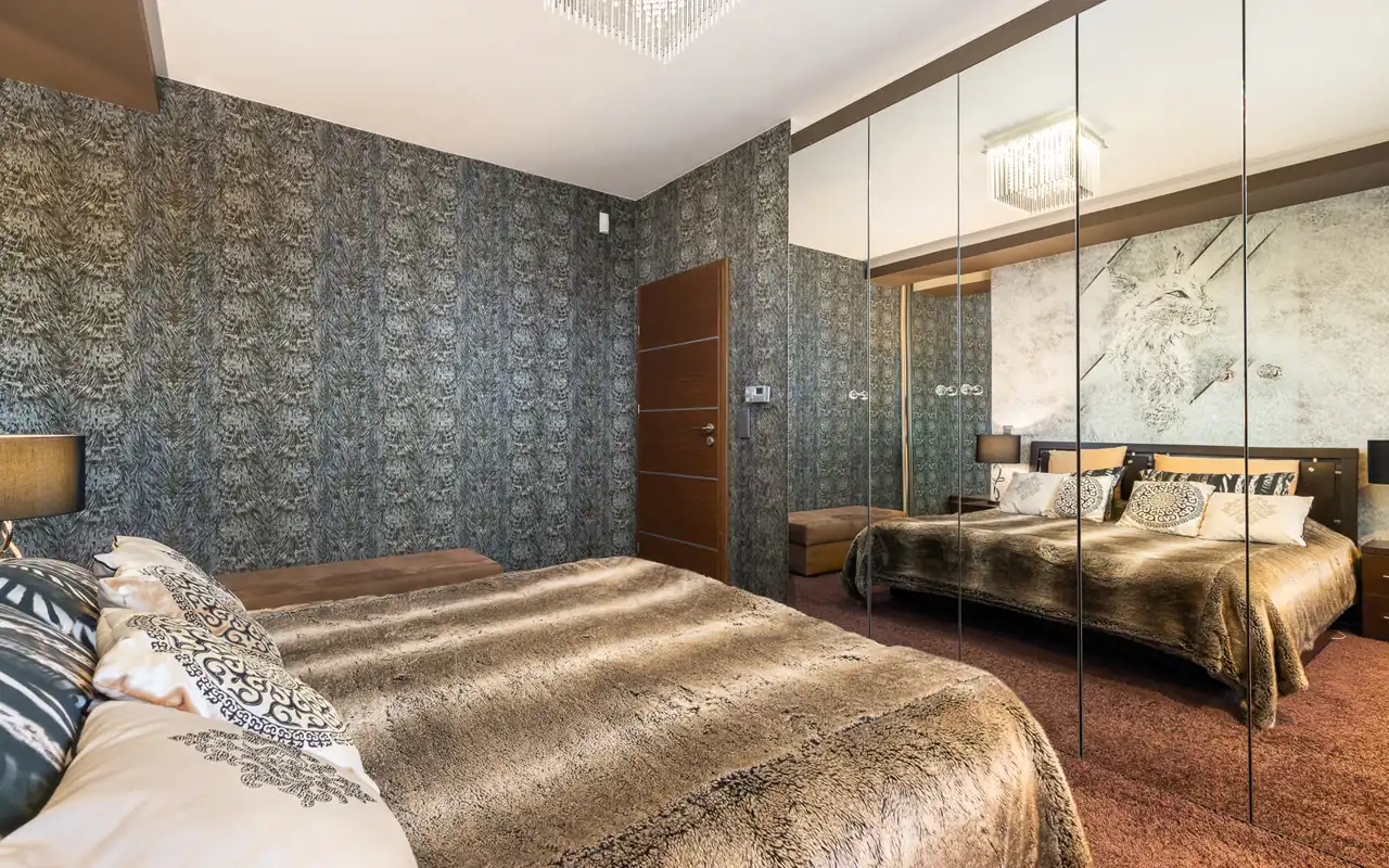 Dom wykończono materiałami najwyższej jakości. W sypialniach położona jest wykładzina a na pozostałych powierzchniach gres (podłoga podgrzewana). Główną sypialnię oraz korytarz zdobi tapeta Roberto Cavalli. W jadalni możemy podziwiać tapicerowaną ścianę zdobioną kryształkami Swarovskiego. Fronty zabudowy kuchennej wykonano ze szkła. Liczne lustra i oświetlenie LED dodatkowo powiększają optycznie przestrzeń tej nieruchomości. Dom wyposażono również w odkurzacz centralny oraz ekologiczne kolektory słoneczne.