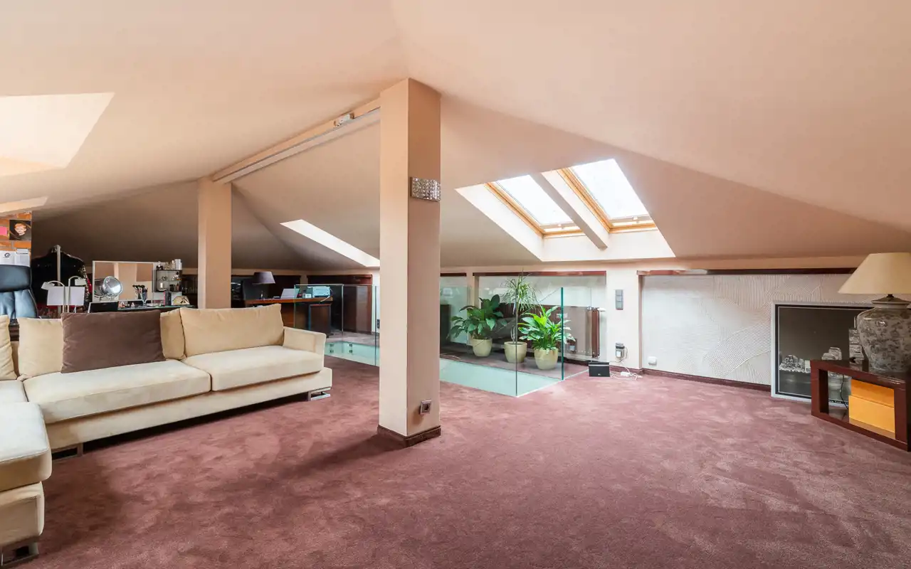 - Zaadaptowane poddasze jako duży otwarty pokój ( open space). Jest to przestrzeń do relaksu (60 m2)