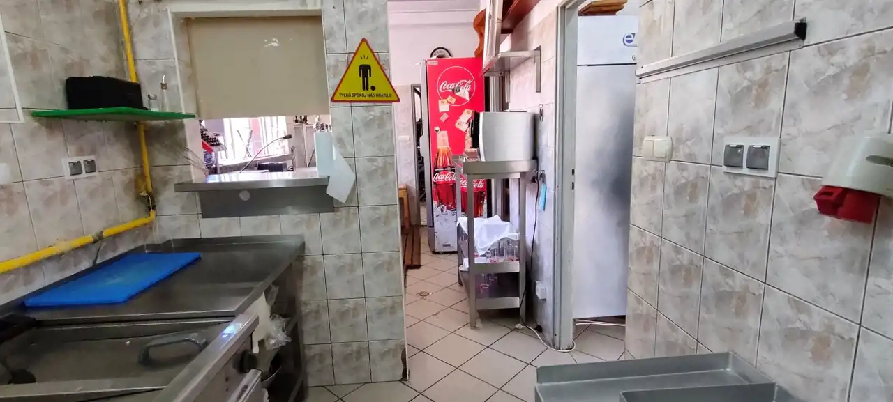 Powierzchnia parteru/ przyziemia 96 m2 na której znajdują pomieszczenia gastronomiczno-produkcyjne, sala restauracyjna, toaleta, pomieszczenie socjalne, magazynowe.
