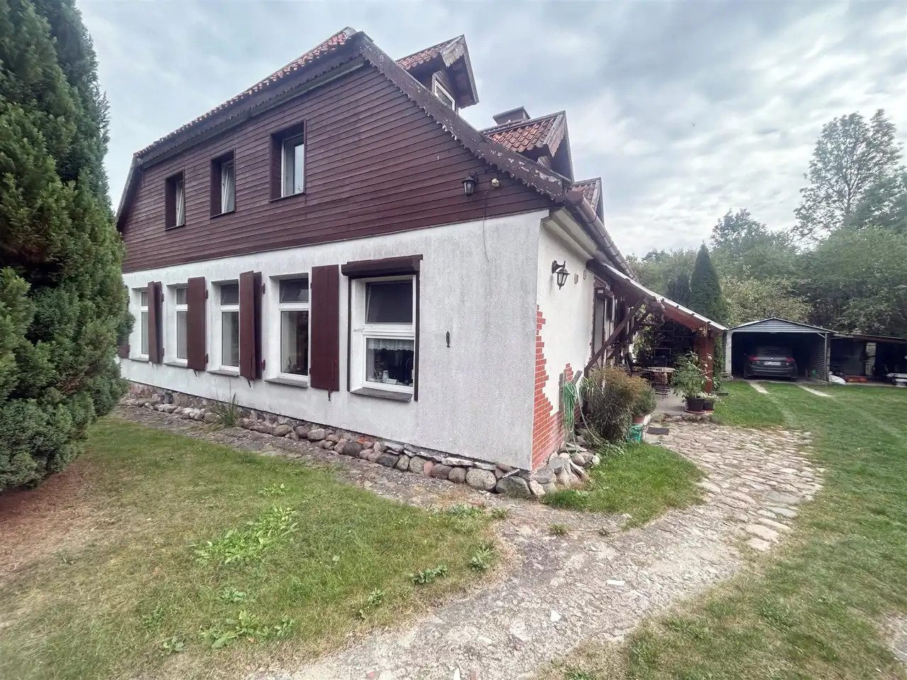 - Działka nr 73 o powierzchni 2424 m² zabudowana budynkiem mieszkalnym (ok. 317 m²) oraz budynkiem gospodarczym (ok. 110 m²).