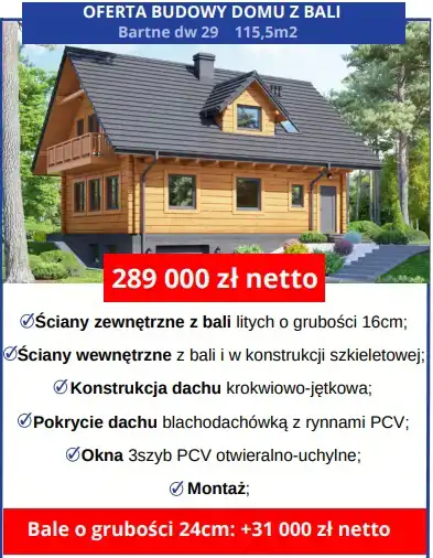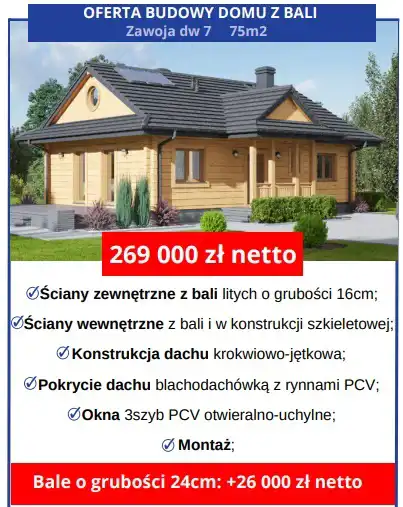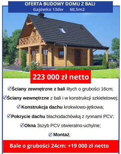 Do zakupu dom z bali drewnianych do wybudowania na własnej działce lub działce do nabycia.
