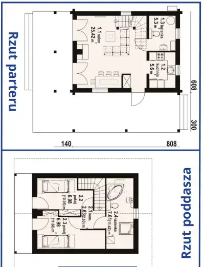 Piętro: (podane powierzchni użytkowe, całkowite odpowiednio większe) pokoje 13/14/10m2, łazienka 5,75m2, korytarz 4m2, balkon.