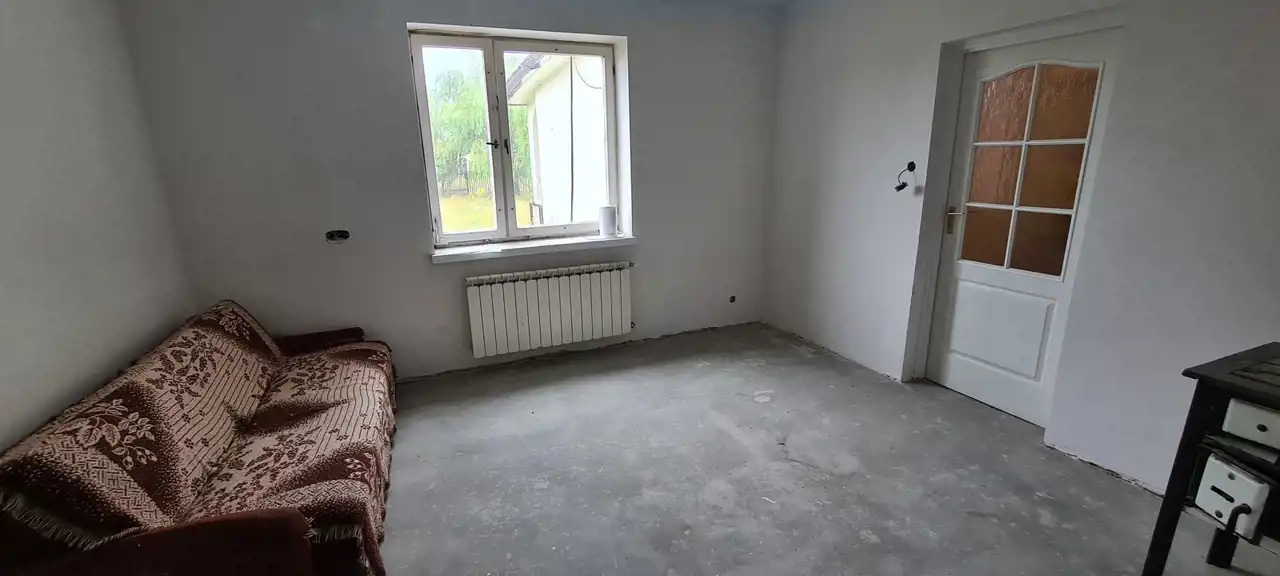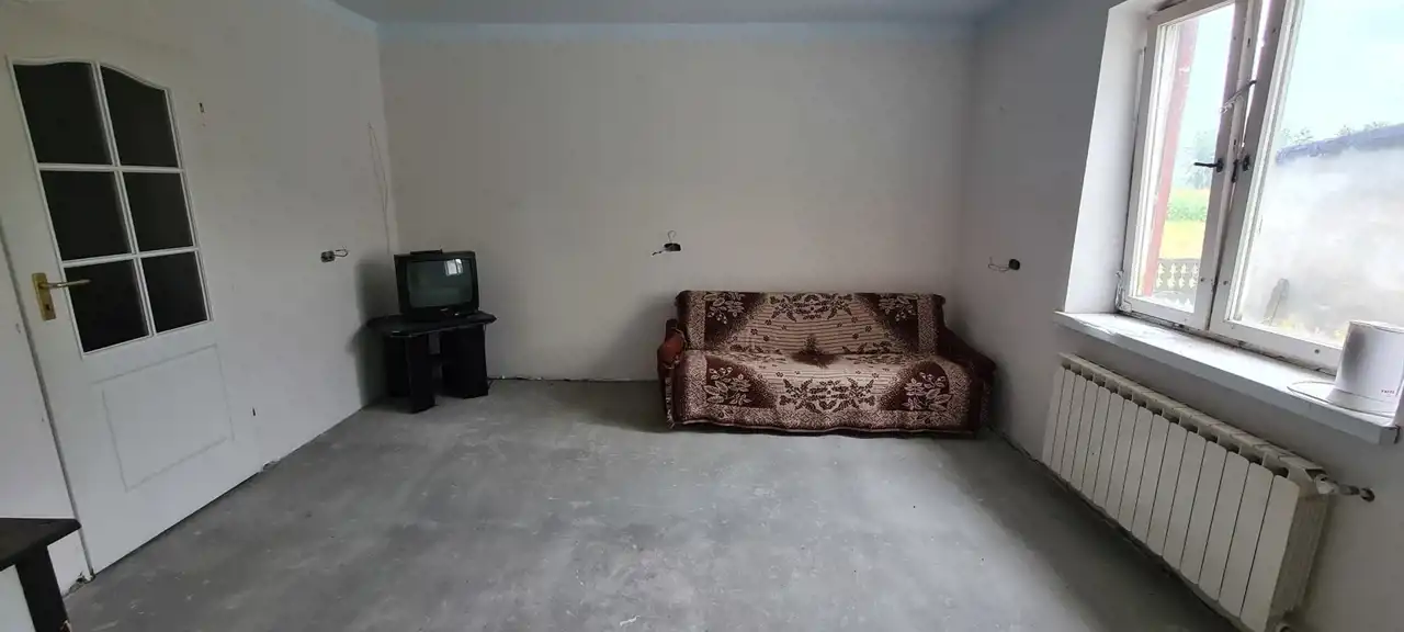 Dom składa się z wiatrołapu o powierzchni 10,8 m.kw, przedpokoju o powierzchni 8,9 m.kw, dwóch sypialni o powierzchni około 19 m.kw każda, dużej kuchni z możliwością zagospodarowania na salon z aneksem kuchennym o powierzchni 17,24 m.kw oraz łazienki o powierzchni ok. 7,2 m.kw. Dom wymaga zaaranżowania. Okna drewniane. Dach domu pokryty papą, dach pomieszczenia gospodarczego również, z tym że ten potrzebuje remontu.