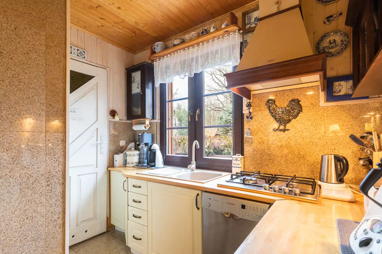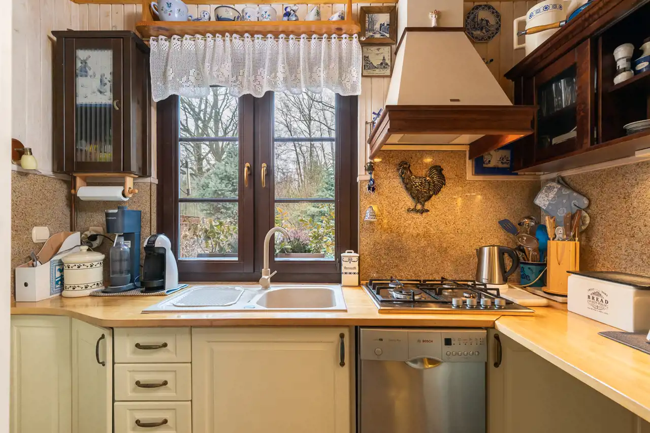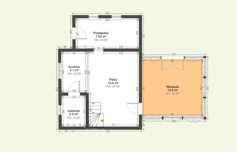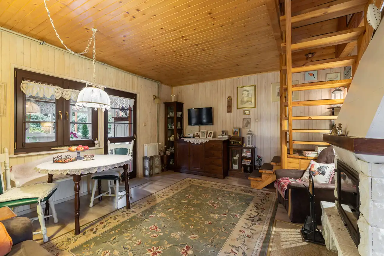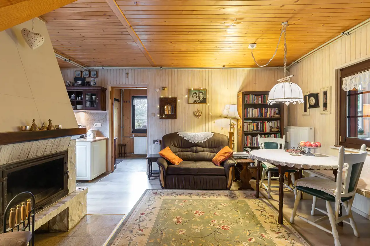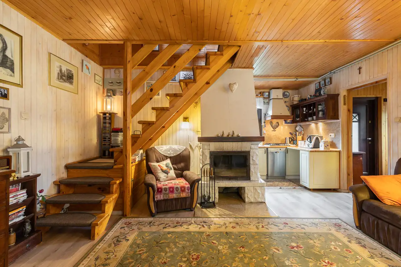Na parterze mamy przedsionek, salon z otwartą kuchnią, łazienka oraz pokój letni/weranda. Klimatu w salonie dodaje kominek opalany drewnem.