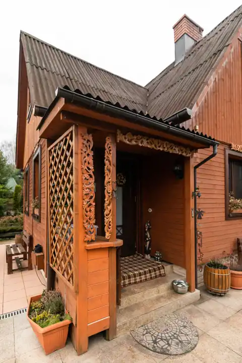 Na terenie posesji znajduje się drewniany domek techniczny. Garaż w postaci wiaty przylega do budynku.