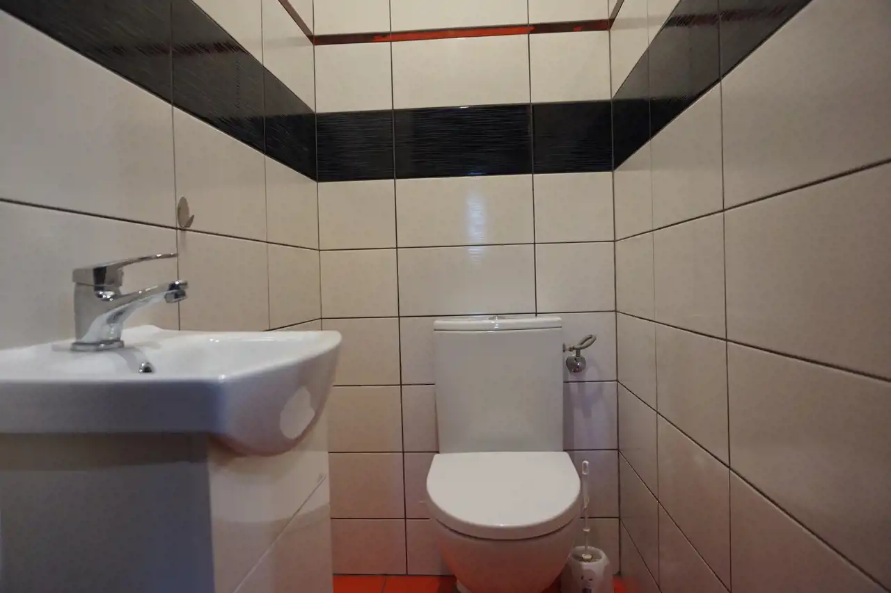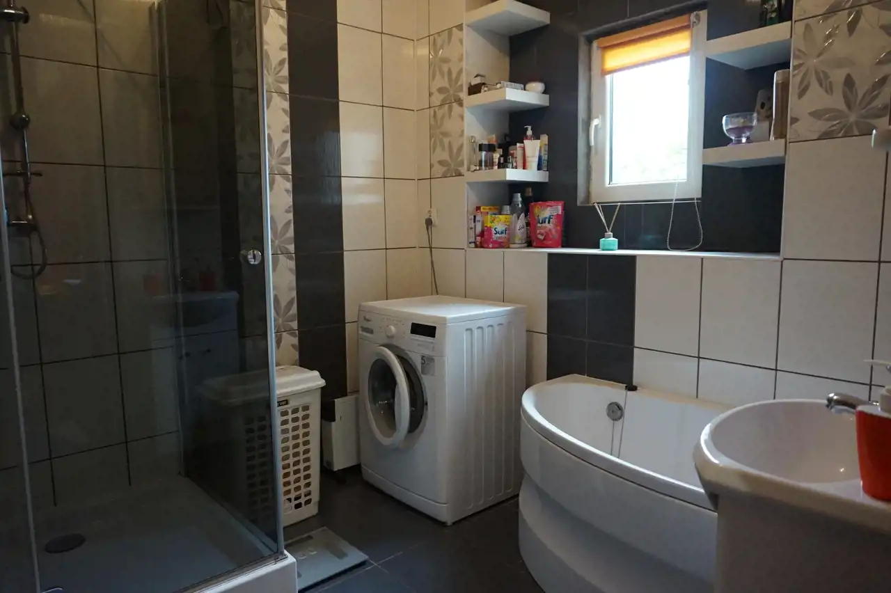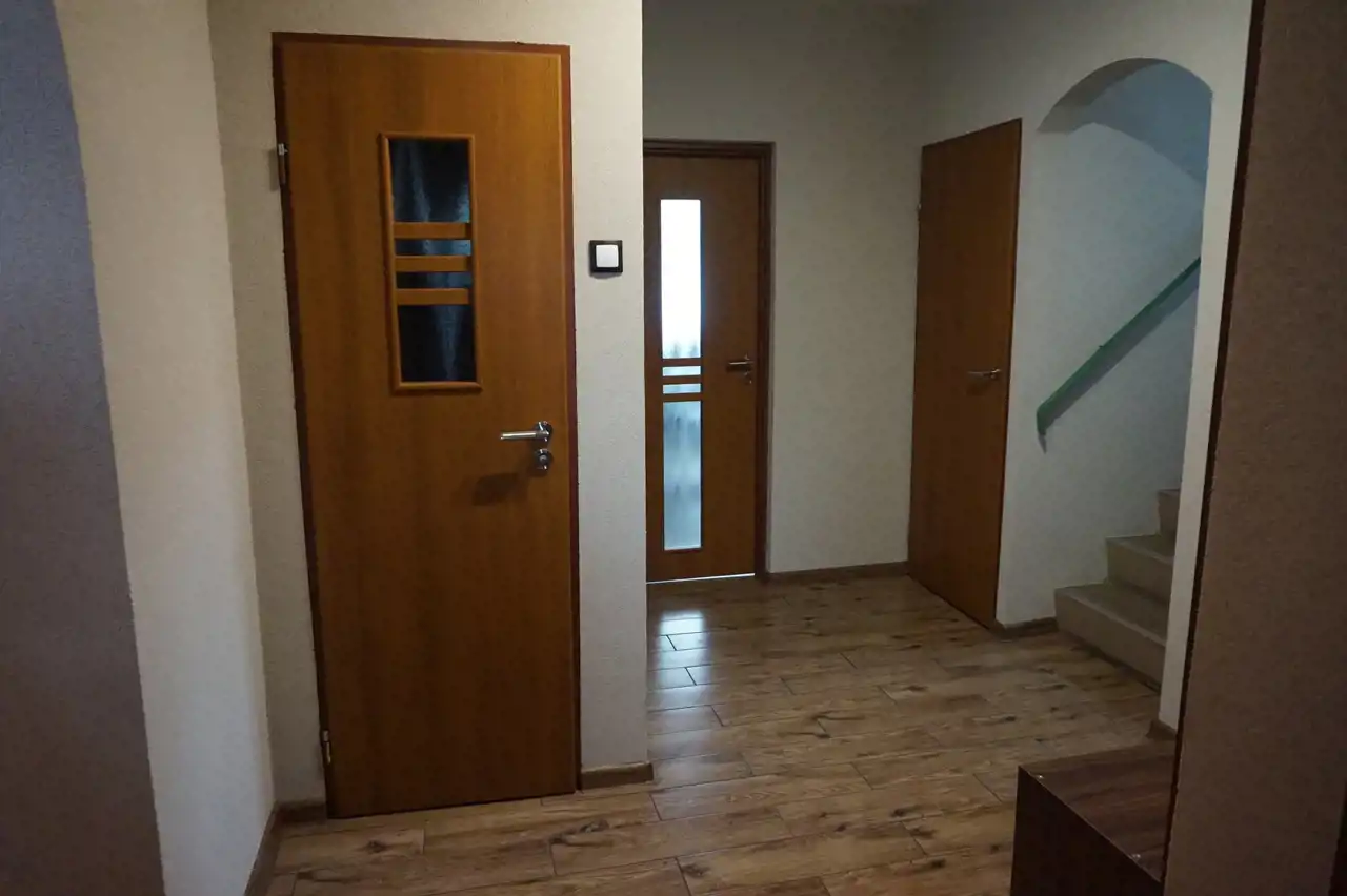Na parterze znajduje się wiatrołap o powierzchni ok. 9,9 m.kw, hall o powierzchni ok. 7,7 m.kw, kuchnia z jadalnią o powierzchni ok. 20 m.kw, salon o powierzchni ok. 18 m.kw, łazienka o powierzchni ok. 5,50 m.kw, wc o powierzchni ok. 1 m.kw, pomieszczenie gospodarcze o powierzchni ok. 1,2 m.kw, kotłownia o powierzchni ok. 7,5 m.kw oraz klatka schodowa. W salonie na podłodze położone są panele, na ścianach gładź gipsowa, pomalowane. W kuchni na podłodze położona jest terakota, ściany częściowo wykończone glazurą oraz gładzią gipsową, pomalowane. Kuchnia wyposażona w meble oraz sprzęt agd (lodówka, kuchenka gazowa, zmywarka, zlewozmywak). Łazienka wykończona glazurą i terakotą wyposażona w kabinę prysznicową, wannę, umywalkę oraz grzejnik drabinkowy. W łazience znajduje się okno, dzięki czemu mamy dobrą wentylację.