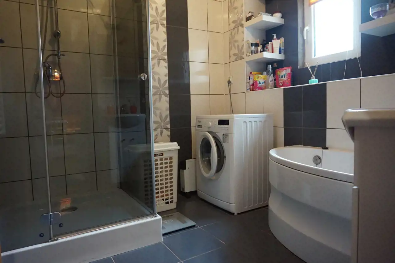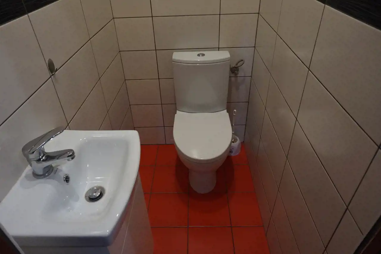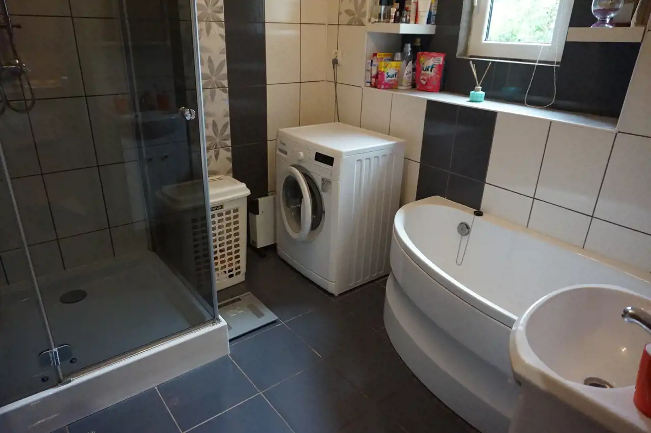 Na parterze znajduje się wiatrołap o powierzchni ok. 9,9 m.kw, hall o powierzchni ok. 7,7 m.kw, kuchnia z jadalnią o powierzchni ok. 20 m.kw, salon o powierzchni ok. 18 m.kw, łazienka o powierzchni ok. 5,50 m.kw, wc o powierzchni ok. 1 m.kw, pomieszczenie gospodarcze o powierzchni ok. 1,2 m.kw, kotłownia o powierzchni ok. 7,5 m.kw oraz klatka schodowa. W salonie na podłodze położone są panele, na ścianach gładź gipsowa, pomalowane. W kuchni na podłodze położona jest terakota, ściany częściowo wykończone glazurą oraz gładzią gipsową, pomalowane. Kuchnia wyposażona w meble oraz sprzęt agd (lodówka, kuchenka gazowa, zmywarka, zlewozmywak). Łazienka wykończona glazurą i terakotą wyposażona w kabinę prysznicową, wannę, umywalkę oraz grzejnik drabinkowy. W łazience znajduje się okno, dzięki czemu mamy dobrą wentylację.