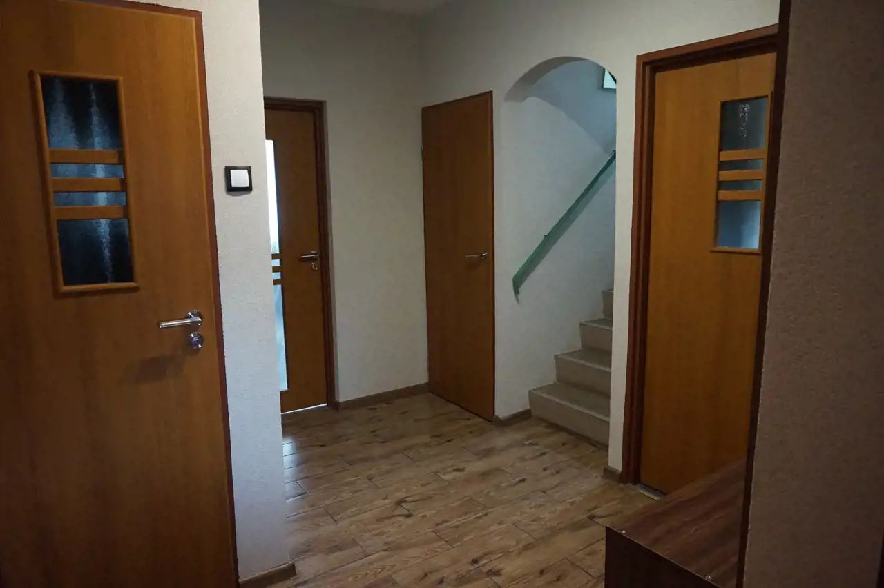 Na piętrze o łącznej powierzchni 33 m.kw znajdują się trzy pokoje o powierzchni ok. 8 m.kw, 5,2 m.kw, 5,3 m.kw oraz hall o powierzchni ok. 4,7 m.kw.