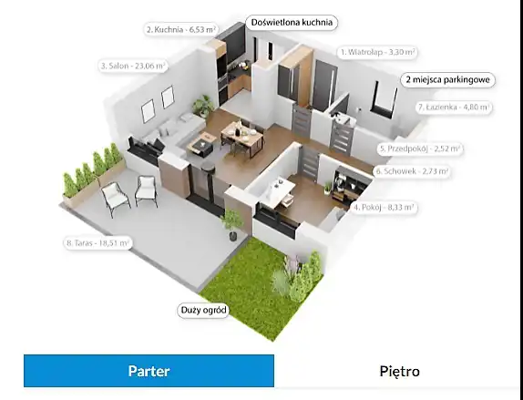 Przed domami znajduje się trójfazowa instalacja elektryczna z przeznaczeniem do ładowania samochodów elektrycznych. Lokale posiadają po dwa miejsca parkingowe. Przestrzeń z tyłu domów zajmuje taras i ogród, w którym można odpocząć po pracy, urządzić spotkanie z bliskimi czy bawić się z dziećmi. Na piętrze znajduje się balkon.