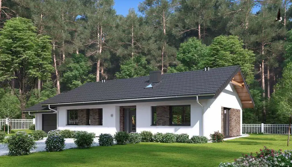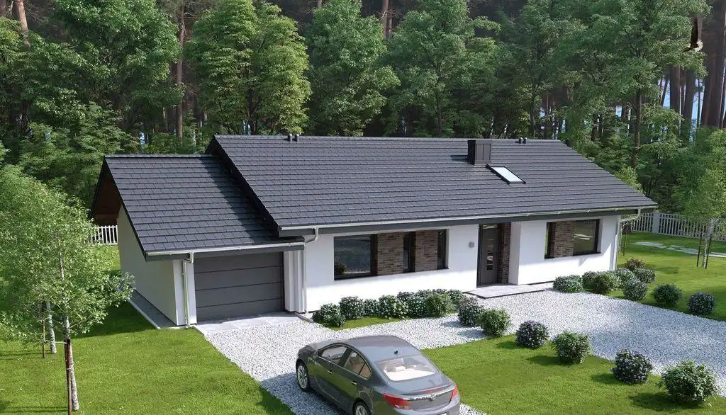 Północ Nieruchomości Pabianice ma do sprzedaży nowy parterowy dom o powierzchni całkowitej 130,61m.kw. i użytkowej 104,37 usytuowany na obrzeżach Pabianic w miejscowości Rydzyny. Dom rozpoczęcie budowy ma w 2021 roku a planowany odbiór na II kwartał roku 2022 (budynek w trakcie budowy), według projektu HP SMART. Dom w stanie deweloperskim posadowiony na działce o powierzchni 1 350m.kw. Ściany zewnętrzne z pustaka ceramicznego, ocieplone styropianem, na fundamentach betonowych. Dach pokryty dachówką. Nieruchomość ogrodzona będzie płotem panelowym, brama wjazdowa oraz furtka. Ogrzewanie podłogowe w całym domu (także w garażu) za pomocą pieca na pelet lub gazowego ( w ulicy planowane jest podłączenie gazu). Okna pcv, drzwi wejściowe antywłamaniowe. Dom bardzo pięknie doświetlony światłem dziennym. Z salonu wyjście na taras a z niego widok na lasek brzózek co daje komfort i prywatność.