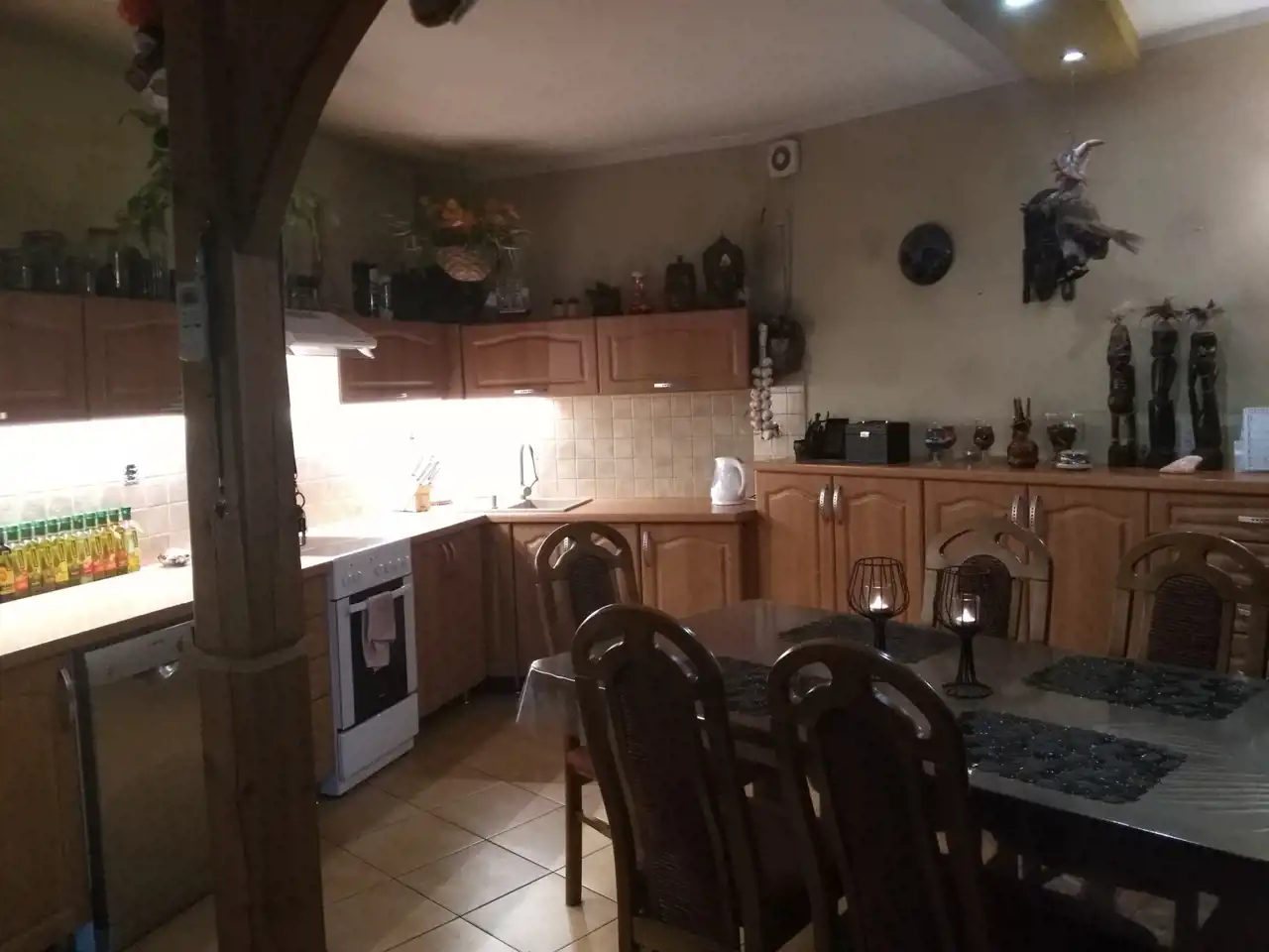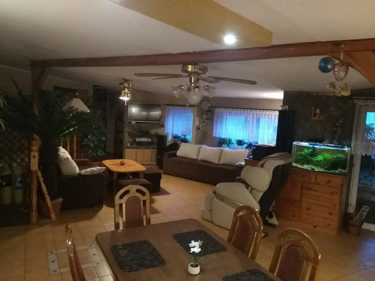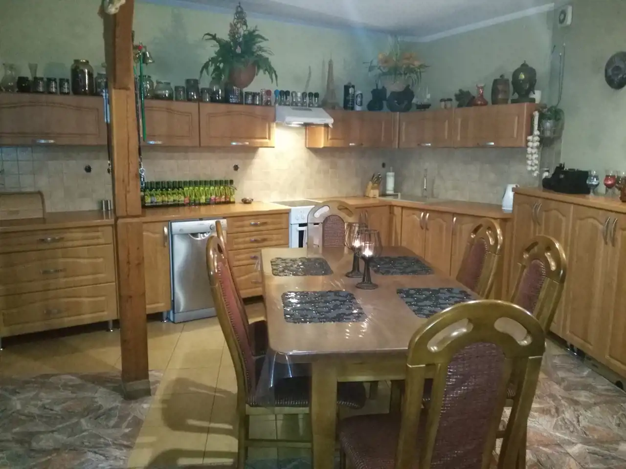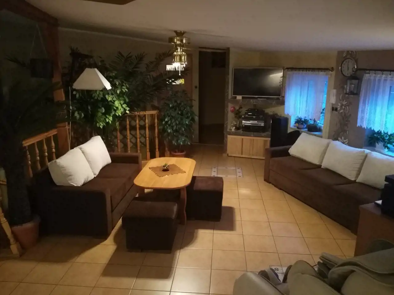 Jeden z domów wykończony i zamieszkały jest od 2007 roku (decyzja na budowę wydana w 1998r.). Dom parterowy z poddaszem użytkowym o powierzchni ok. 250 m.kw. Wybudowany z cegły czerwonej oraz pustaka suporex, ogrzewanie podłogowe za pomocą pieca na eko-groszek, ciepła woda także z pieca na eko-groszek. Dom posiada oświetlenie zewnętrzne umieszczone w podbitce. Dach - stropodach pokryty papą. Na parterze znajdują się: hall o pow. ok. 12 m.kw, kuchnia ze spiżarnią o pow. ok. 18 m.kw, łazienka o pow. ok. 6 m.kw, dwa pokoje przechodnie o pow. ok. 25 m.kw i 16 m.kw oraz duży garaż z kanałem o pow. ok. 40 m.kw i kotłownia o pow. ok. 10 m.kw. Na piętrze znajdują się: salon z otwartą kuchnią o pow. ok. 55 m.kw, taras o pow. ok. 22 m.kw, łazienka o pow. ok. 4 m.kw oraz 3 pokoje o pow. 15 m.kw, 9,5 m.kw i 8 m.kw. W większości pomieszczeń na podłogach znajdują się płytki, w pokojach na piętrze położone są panele. Na ścianach gładź gipsowa. Wbudowane szafy pozostają, pozostałe meble do uzgodnienia. Stan domu dobry - do odświeżenia. Okna pcv dobrej jakości w kolorze złoty dąb, drzwi antywłamaniowe.