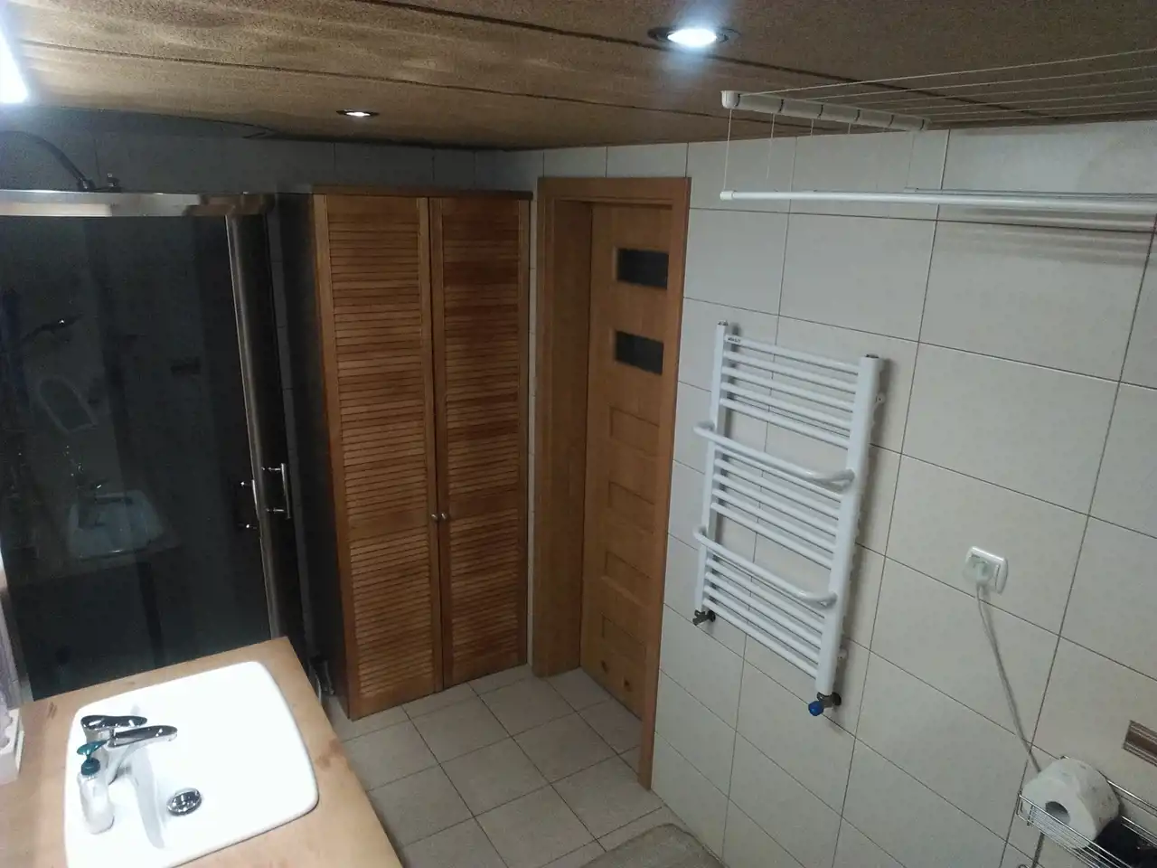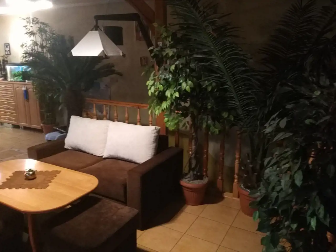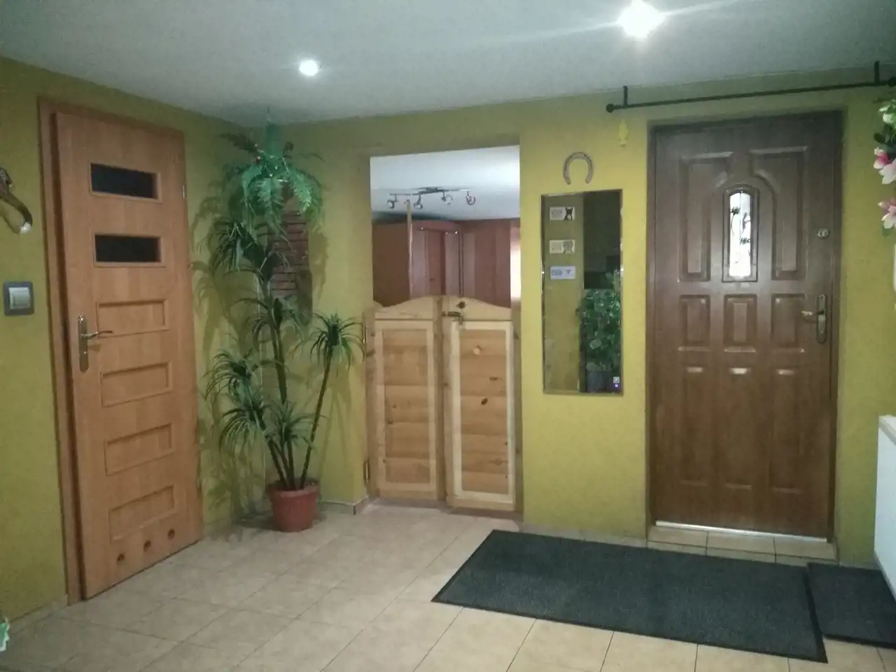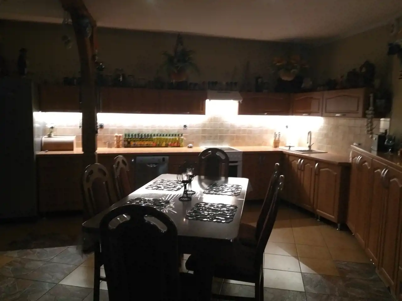 Jeden z domów wykończony i zamieszkały jest od 2007 roku (decyzja na budowę wydana w 1998r.). Dom parterowy z poddaszem użytkowym o powierzchni ok. 250 m.kw. Wybudowany z cegły czerwonej oraz pustaka suporex, ogrzewanie podłogowe za pomocą pieca na eko-groszek, ciepła woda także z pieca na eko-groszek. Dom posiada oświetlenie zewnętrzne umieszczone w podbitce. Dach - stropodach pokryty papą. Na parterze znajdują się: hall o pow. ok. 12 m.kw, kuchnia ze spiżarnią o pow. ok. 18 m.kw, łazienka o pow. ok. 6 m.kw, dwa pokoje przechodnie o pow. ok. 25 m.kw i 16 m.kw oraz duży garaż z kanałem o pow. ok. 40 m.kw i kotłownia o pow. ok. 10 m.kw. Na piętrze znajdują się: salon z otwartą kuchnią o pow. ok. 55 m.kw, taras o pow. ok. 22 m.kw, łazienka o pow. ok. 4 m.kw oraz 3 pokoje o pow. 15 m.kw, 9,5 m.kw i 8 m.kw. W większości pomieszczeń na podłogach znajdują się płytki, w pokojach na piętrze położone są panele. Na ścianach gładź gipsowa. Wbudowane szafy pozostają, pozostałe meble do uzgodnienia. Stan domu dobry - do odświeżenia. Okna pcv dobrej jakości w kolorze złoty dąb, drzwi antywłamaniowe.
