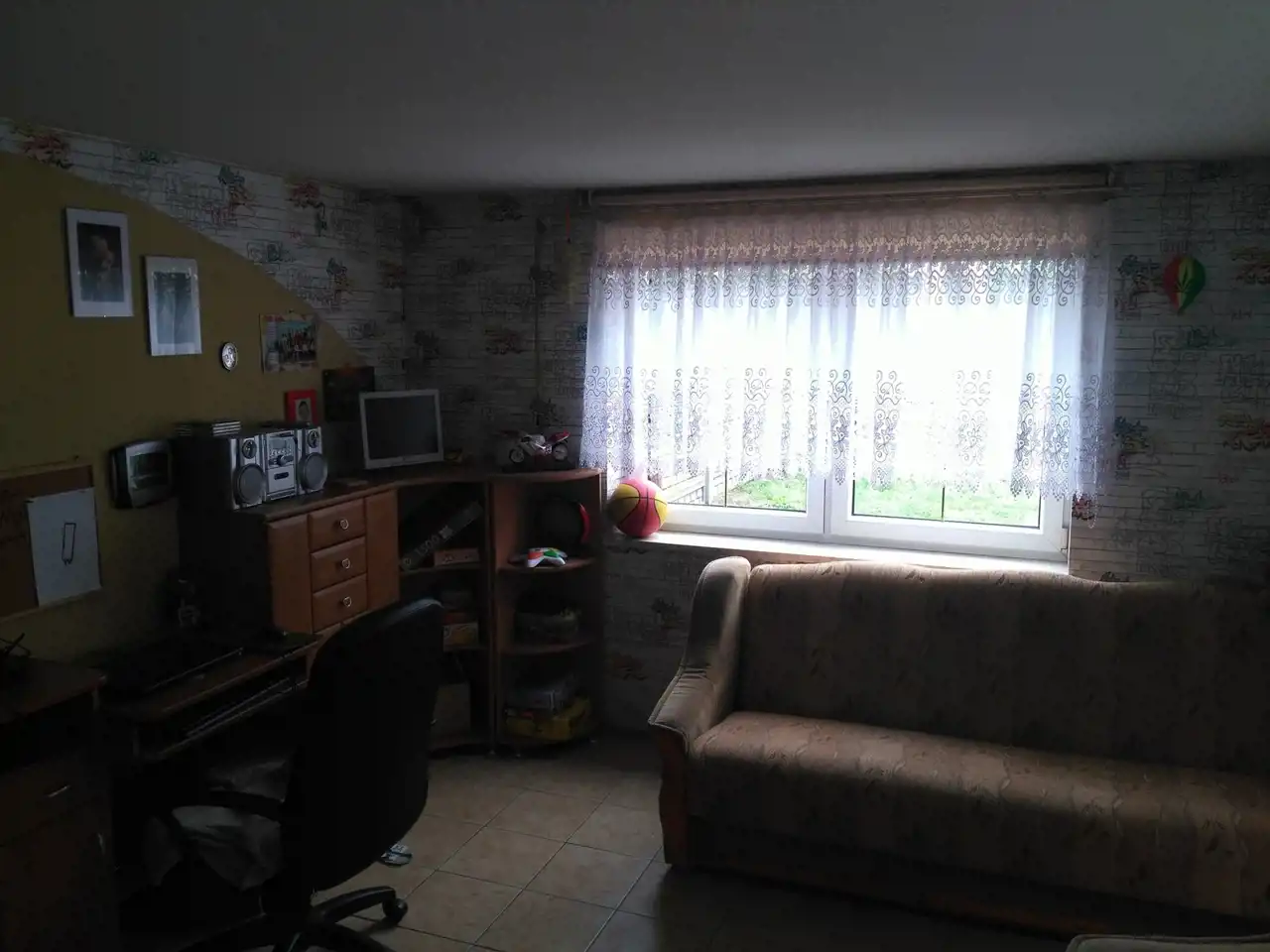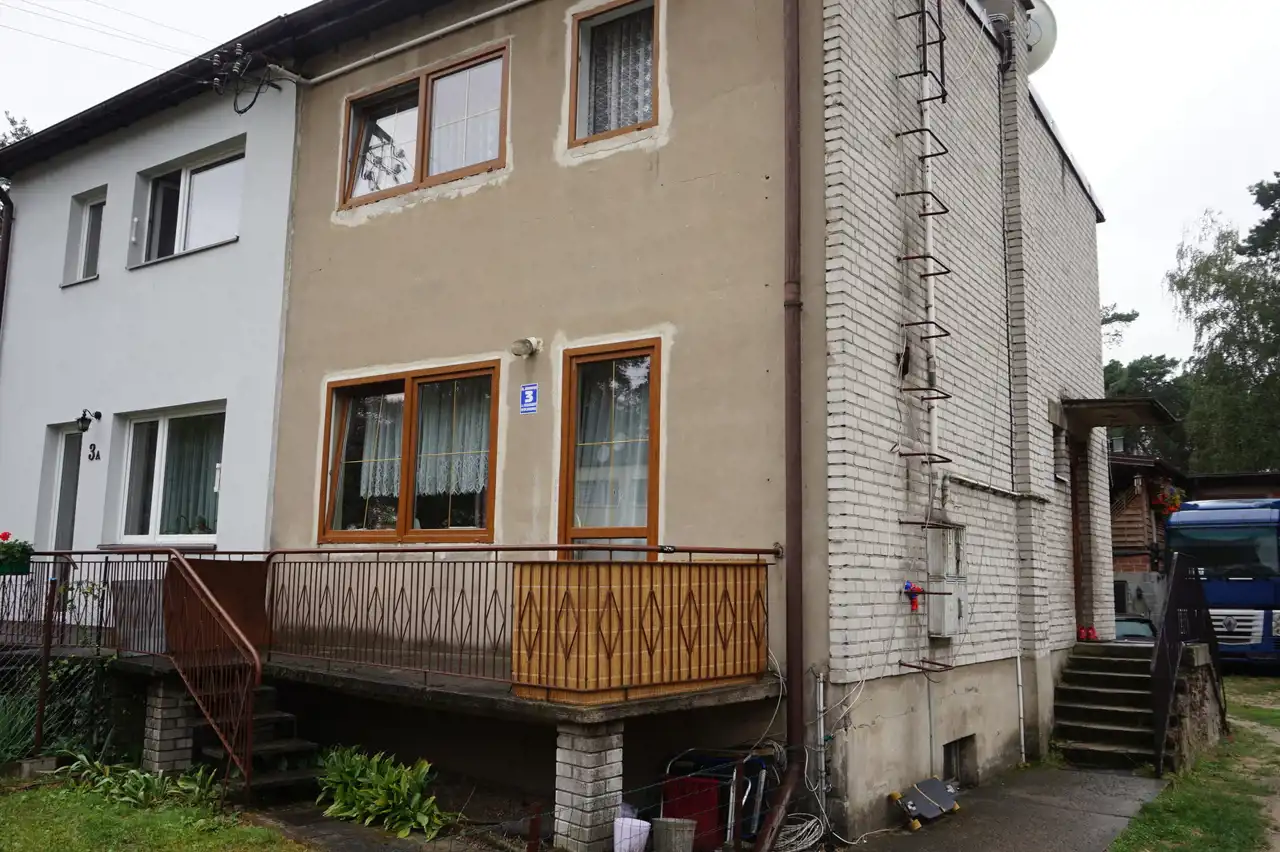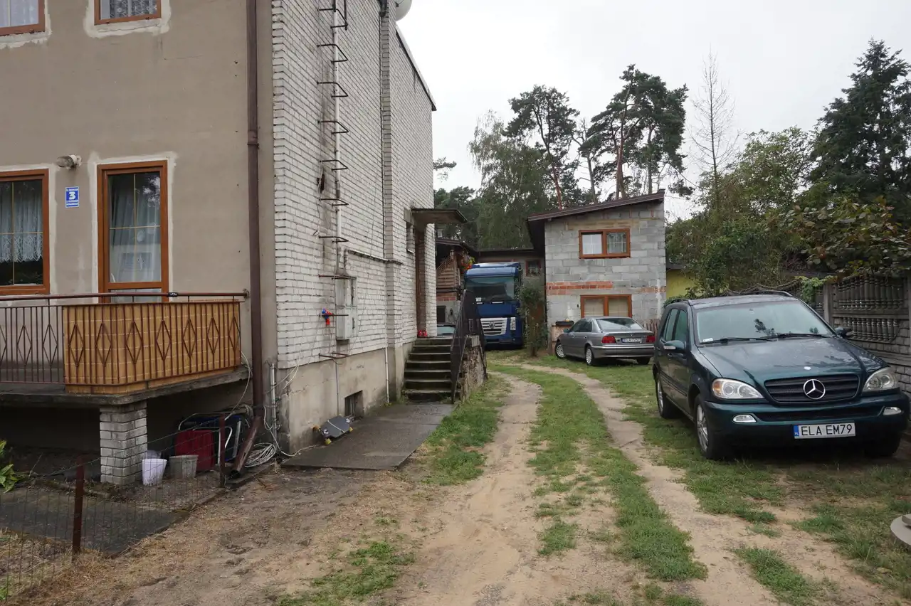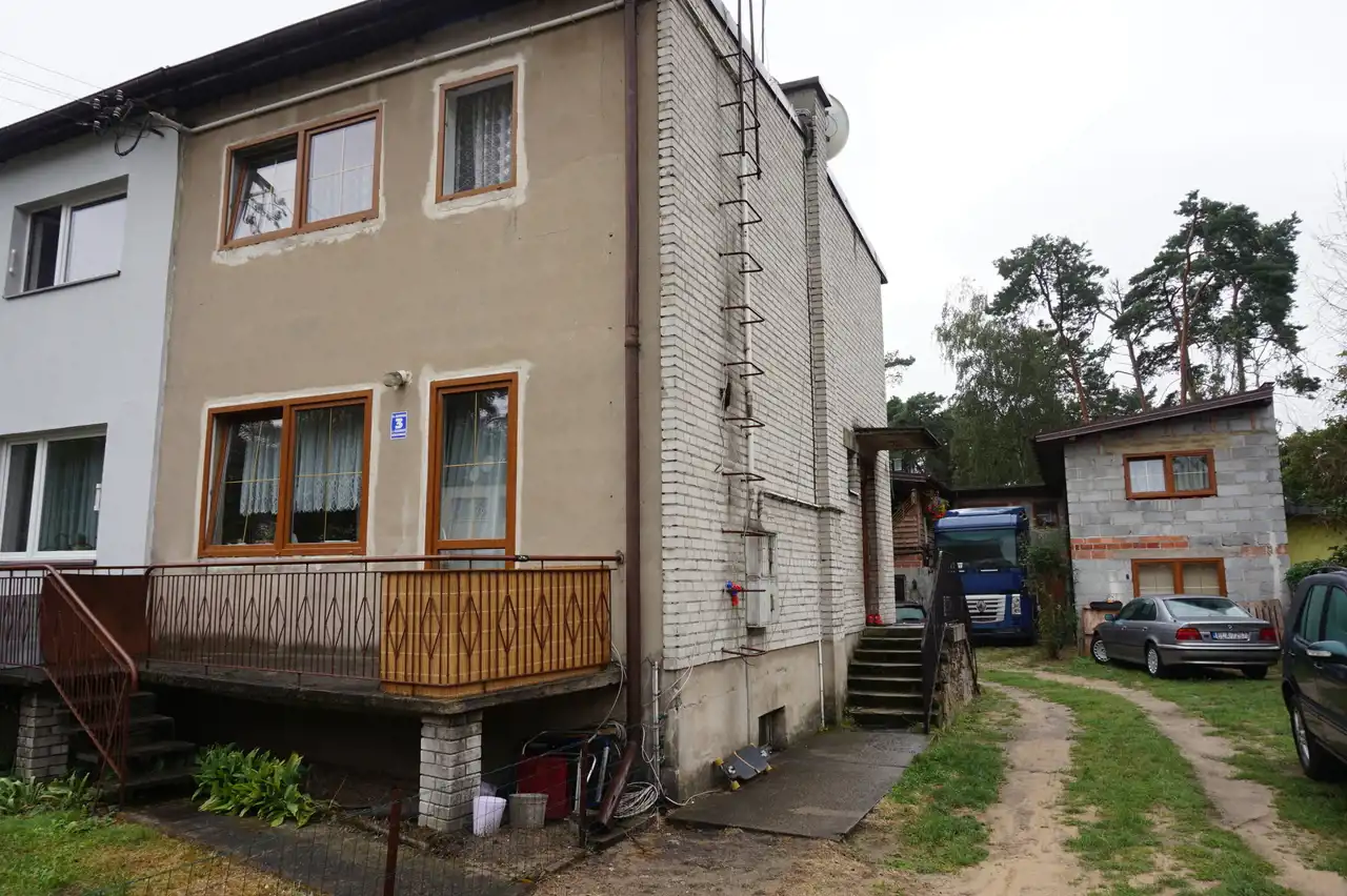 Drugi dom w zabudowie bliźniaczej z roku 1980 o powierzchni ok. 120 m.kw. Dom piętrowy z podpiwniczeniem, wybudowany z cegły ceramicznej, strop - płyta żelbetowa, dach w konstrukcji drewnianej, jednospadowy, pokryty papą. Okna pcv dobrej jakości w kolorze złoty dąb (dwa okna drewniane w piwnicy zostały niewymienione). W piwnicy wydzielone są dwa pomieszczenia: pokój ok. 17 m.kw, kotłownia ok. 20 m.kw, na piętrze znajdują się: salon o pow. ok. 20 m.kw, kuchnia ok. 15 m.kw oraz łazienka o pow. 2 m.kw, na piętra znajdują się dwa pokoje o pow. ok. 20 m.kw oraz 17 m.kw. Stan-domu do remontu.