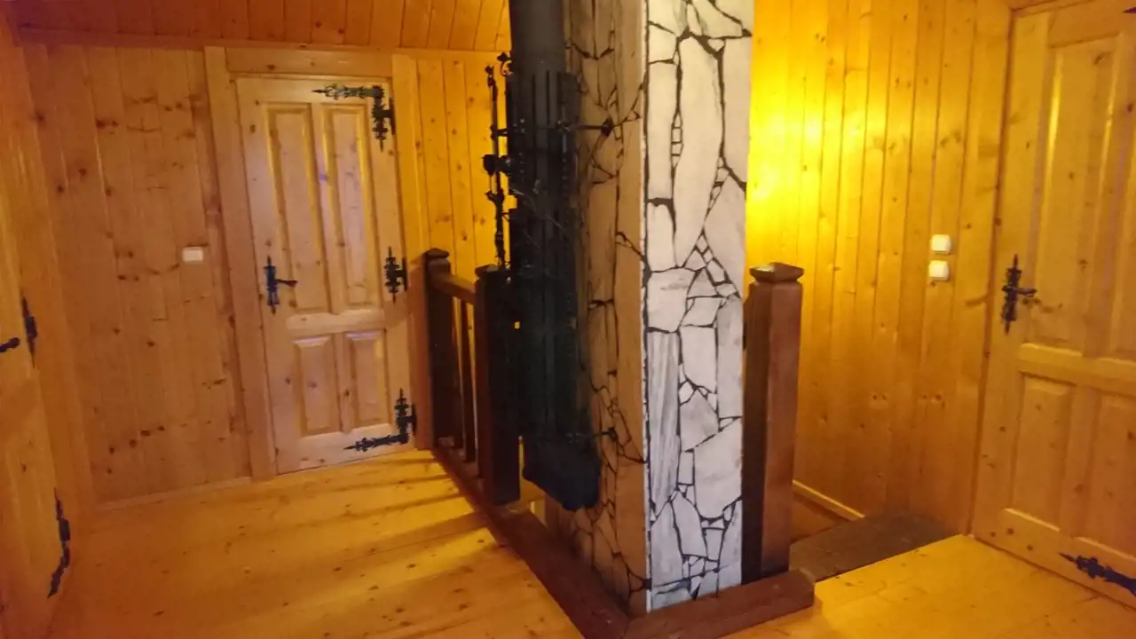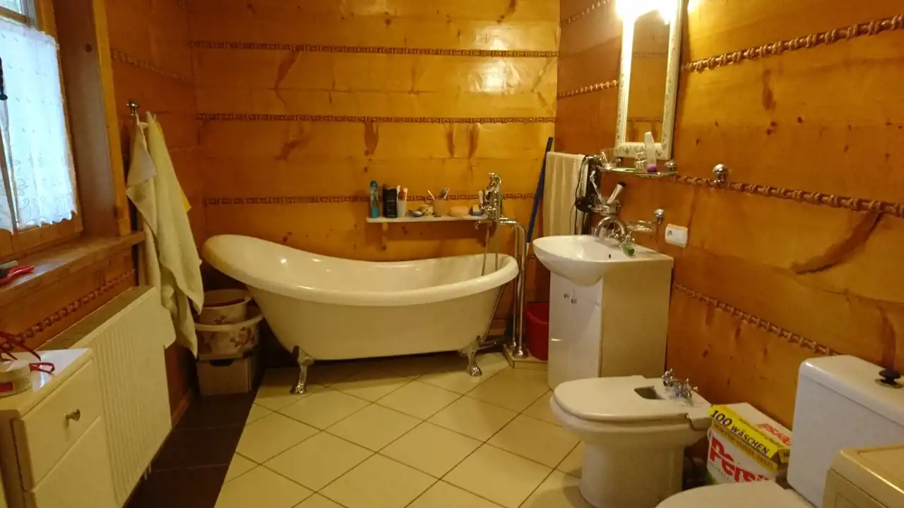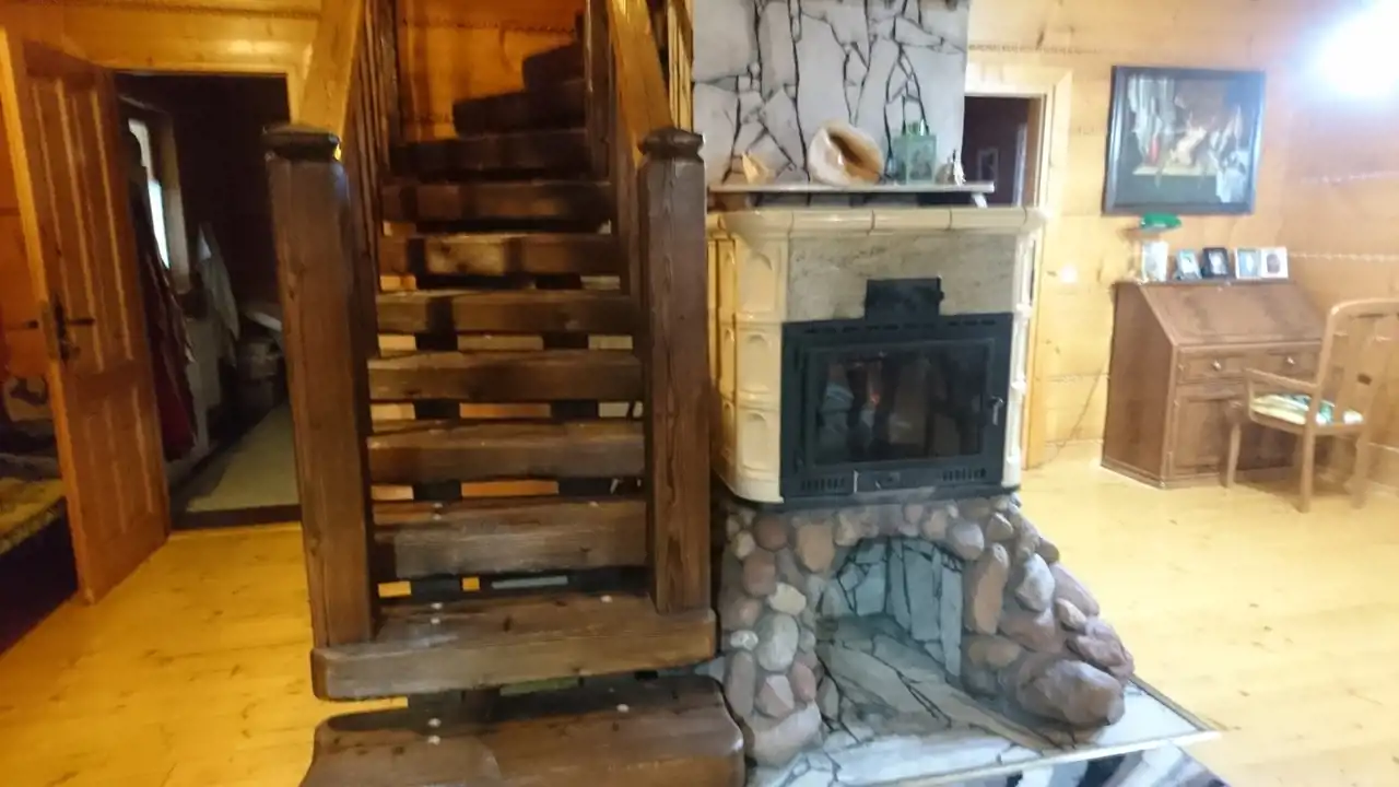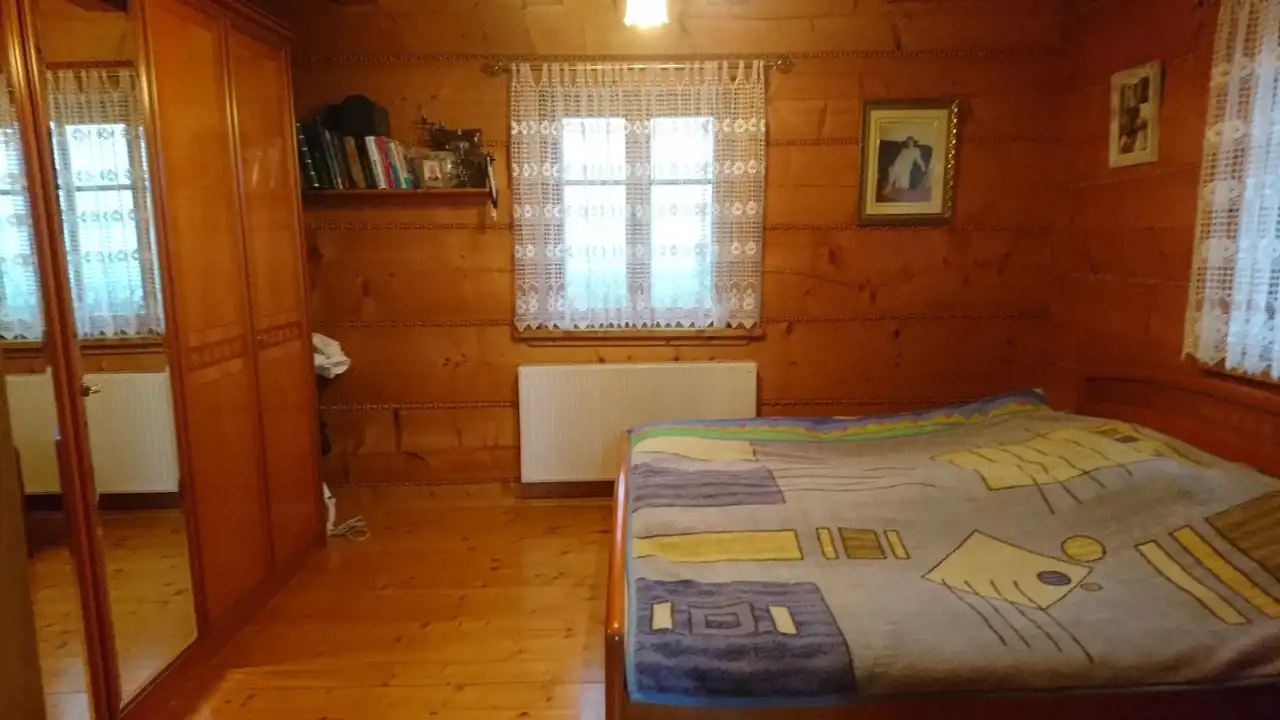 Na działce usytuowany jest dom wolnostojący o powierzchni użytkowej 140 m. kw. Parter domu zbudowanego z drewna - jodły górskiej, składa się z salonu o pow. 30 m.kw., kuchni z o pow. 14 m.kw., pokoju o pow. 16 m.kw. i łazienki o pow. 9,8 m.kw. Piętro składa się z łazienki o pow. 10 m.kw., trzech pokoi o pow. 15 m.kw., 15 m.kw. i 10 m.kw. oraz korytarza. Okna drewniane z ekspozycją na wszystkie strony świata, przy czym wyjście z salonu na taras i ogród jest od strony południowo-zachodniej. Dach pokryty gontem drewnianym. Ogrzewanie elektryczne i kominkowe. Na podłogach położone są drewno i gres. Działka ogrodzona i zagospodarowana. Dodatkowo w ogrodzie duży domek o pow. 100 m.kw, w którym znajduje się osobna kuchnia letnia, garaż i miejsce do składania drewna.