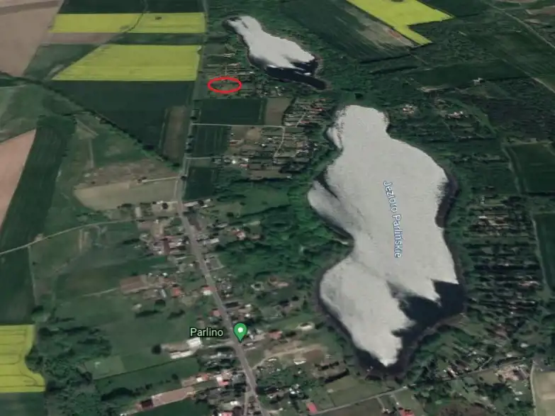 Działka budowlana o powierzchni około 1300m2 wydzielana z większej działki o powierzchni 2667m2 w pobliżu jeziora Kołki i Parlińskie w miejscowości Parlino gm. Stara Dąbrowa.