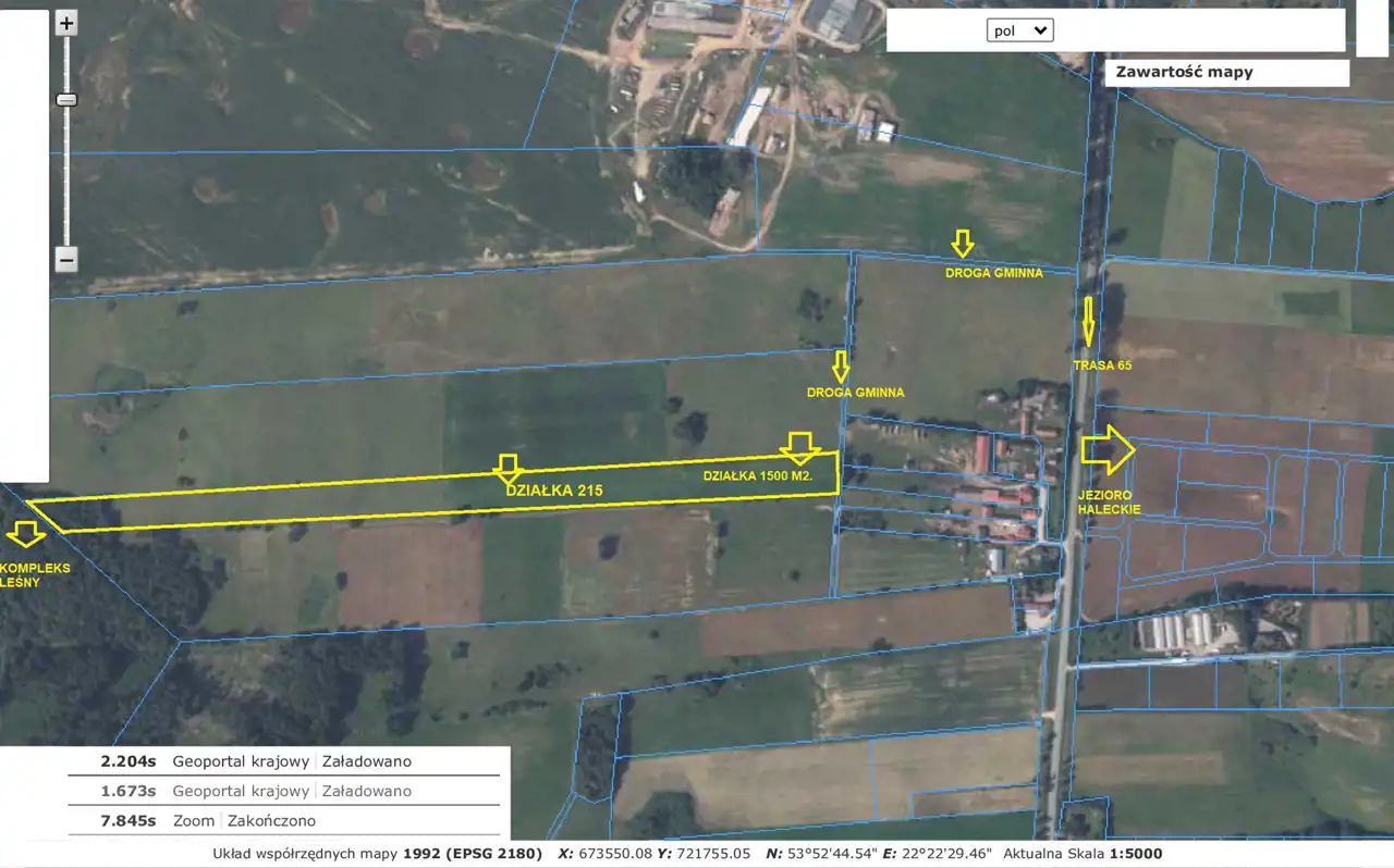 - Działka położona w drugiej linii zabudowy od drogi wojewódzkiej nr 65, co zapewnia ciszę i spokój, a jednocześnie wygodny dojazd.