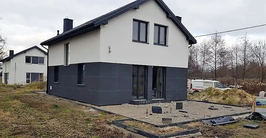 Plyty tarasowe i kostka wokół domu w trakcie realizacji.