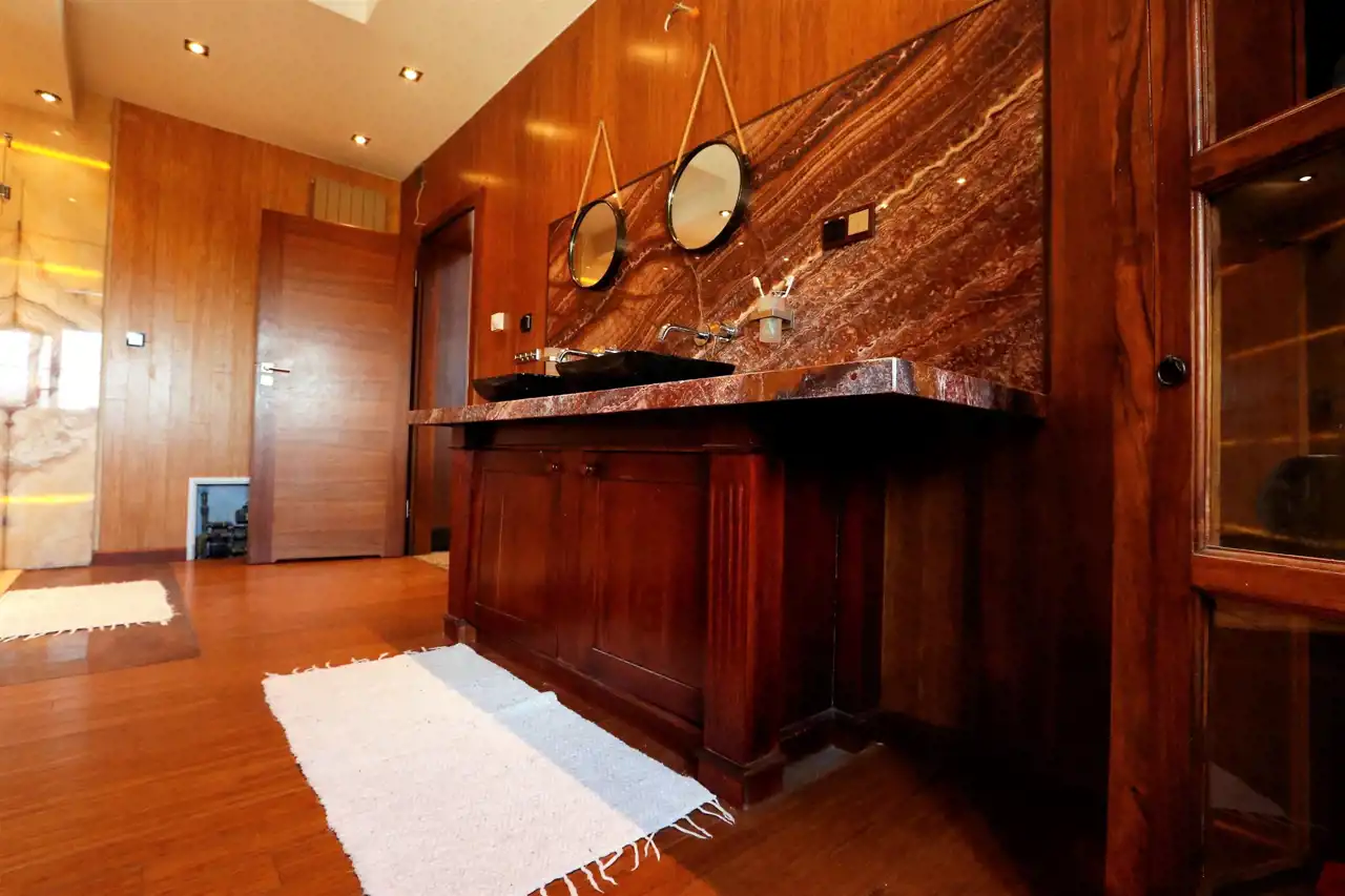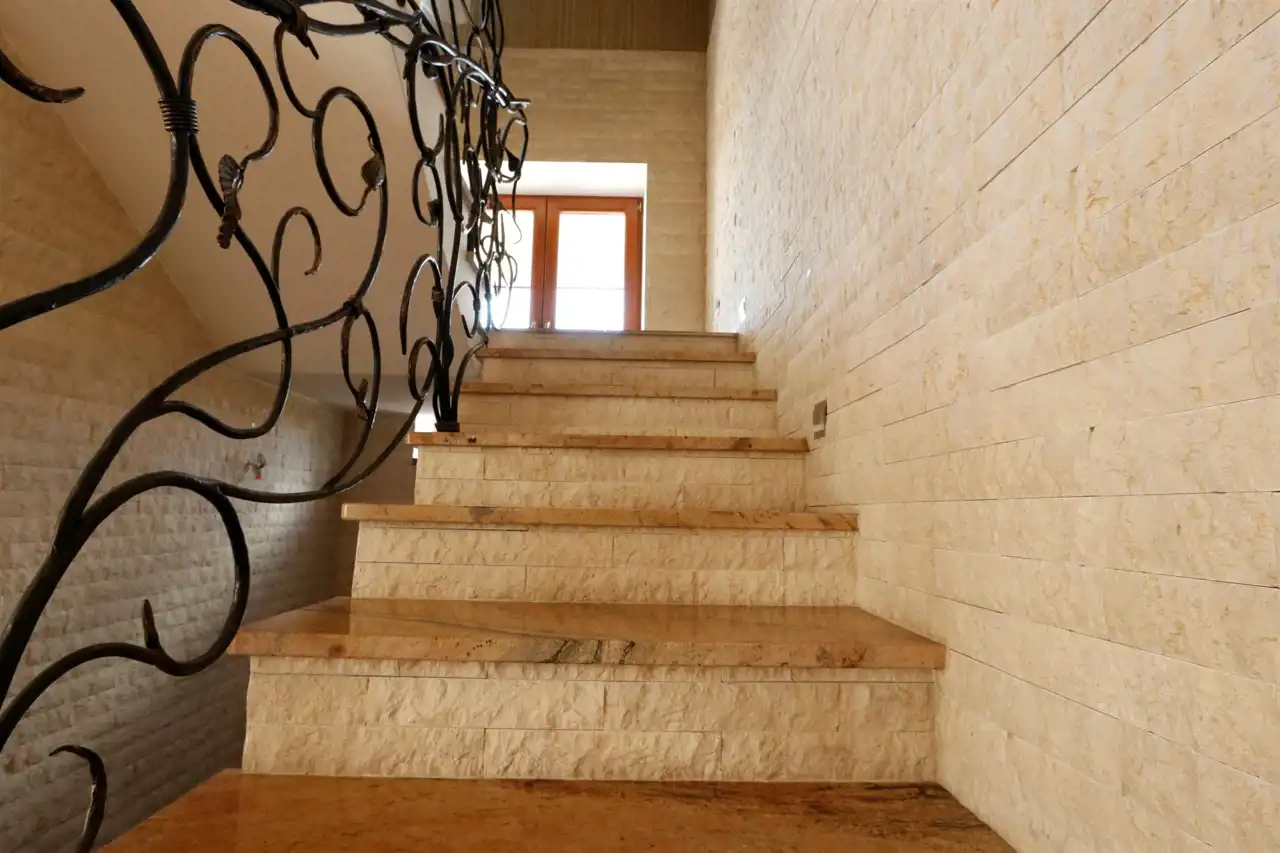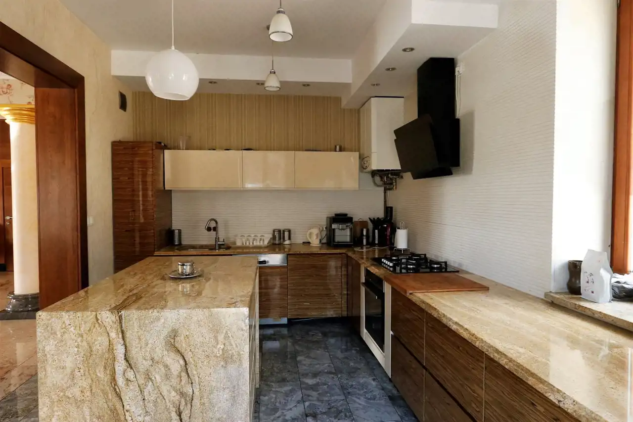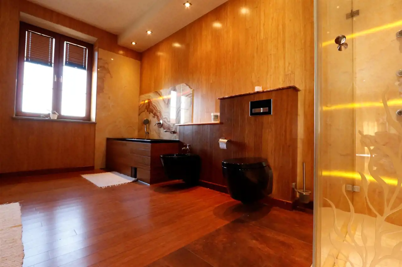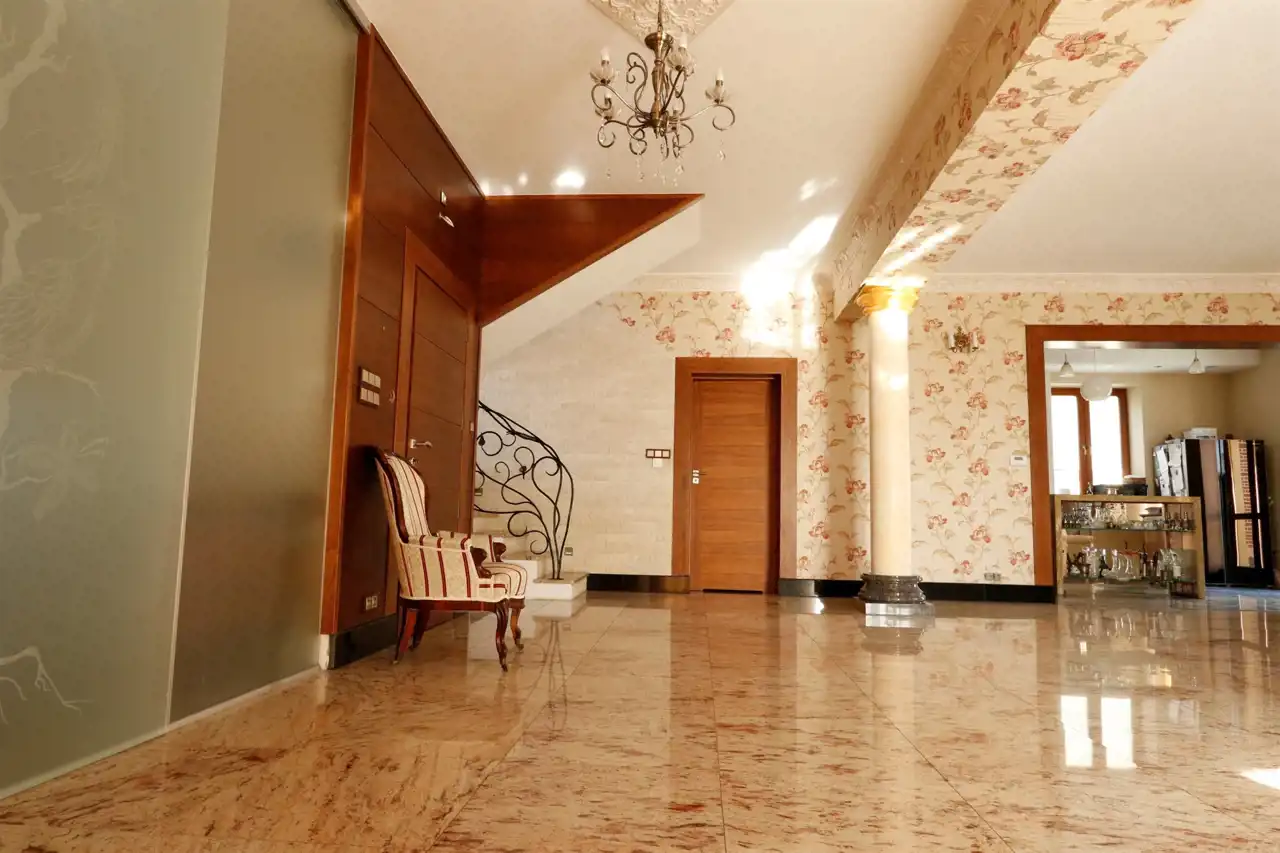 Podłogi w całym domu to połączenie drewna z marmurem , granitem i naturalnymi kamieniami . Ściany i blaty w łazienkach zrobione z naturalnego onyksu , parapety marmurowe .