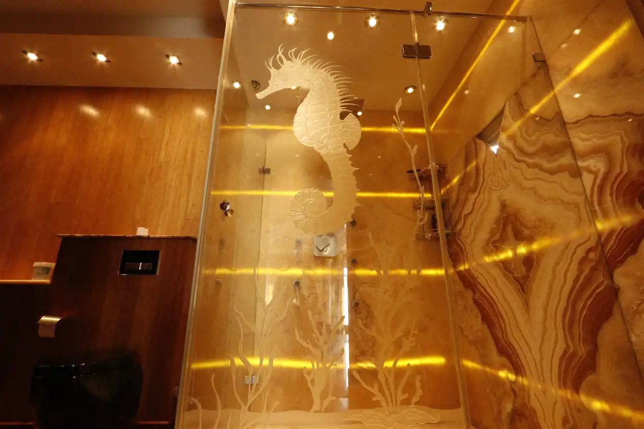 Szklane drzwi w kabinach prysznicowych robione na specjalne zamówienie , grawerowane.