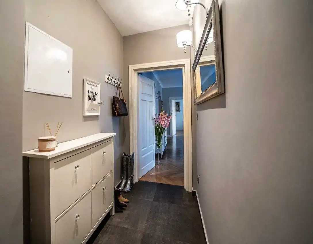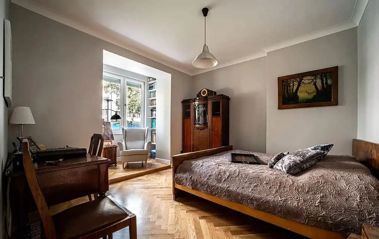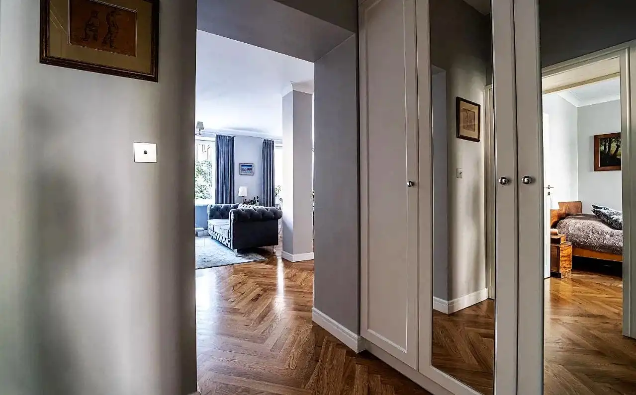 Mieszkanie znajduje się na wysokim parterze kamienicy z 1941r. Apartament o metrażu 92m2 składa się z hallu, kuchni, salonu z jadalnią, dwóch sypialni, korytarza i łazienki (z oknem).