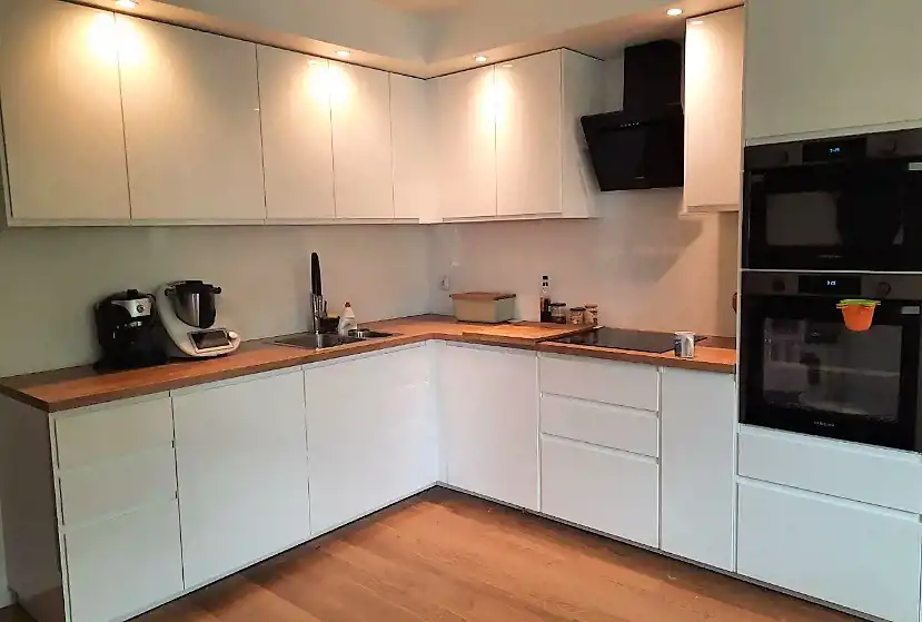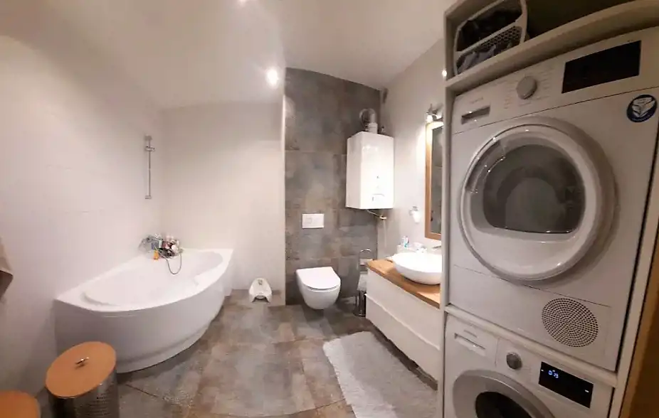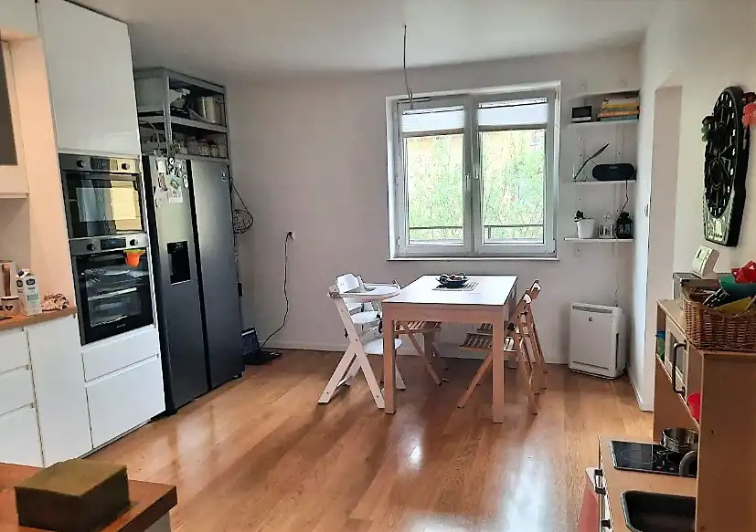 W kuchni znajdują się wszelkie niezbędne sprzęty: lodówka, piekarnik, mikrofalówka, kuchenka, zmywarka. Sprzęty nowe, najwyższej jakości. Na całym poziomie drewniana, dębowa podłoga; na całym poziomie jest też klimatyzacja.
