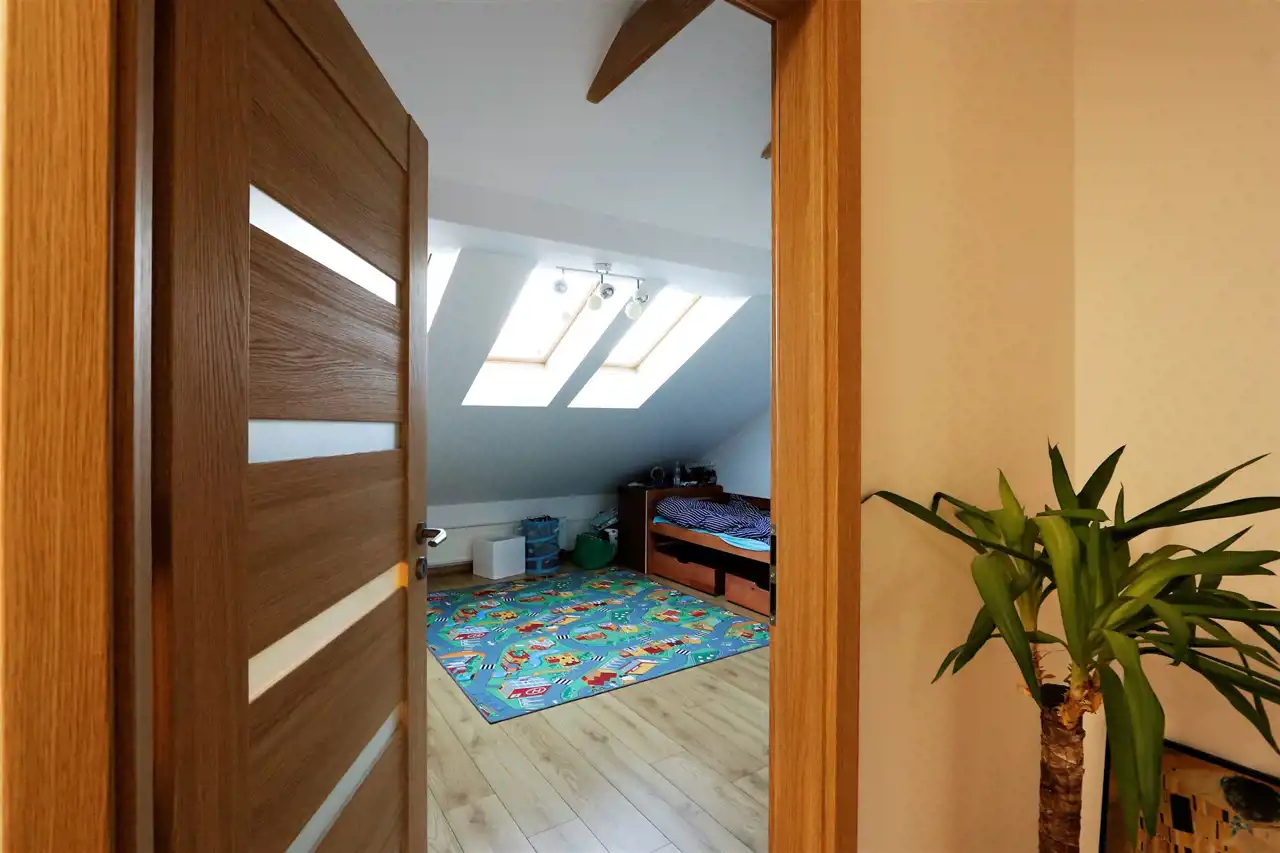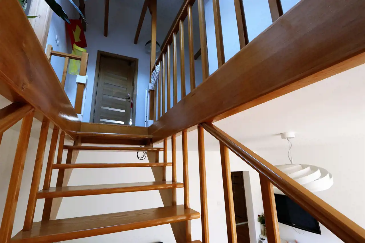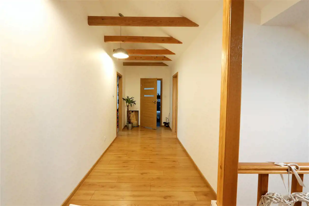Na 2 poziom prowadzą szerokie, piękne schody dębowe. Na 2 poziomie znajduje się duży, przestronny korytarz i 3 pokoje oraz łazienka z prysznicem, toaletą i umywalką. W każdym pokoju - klimatyzacja.