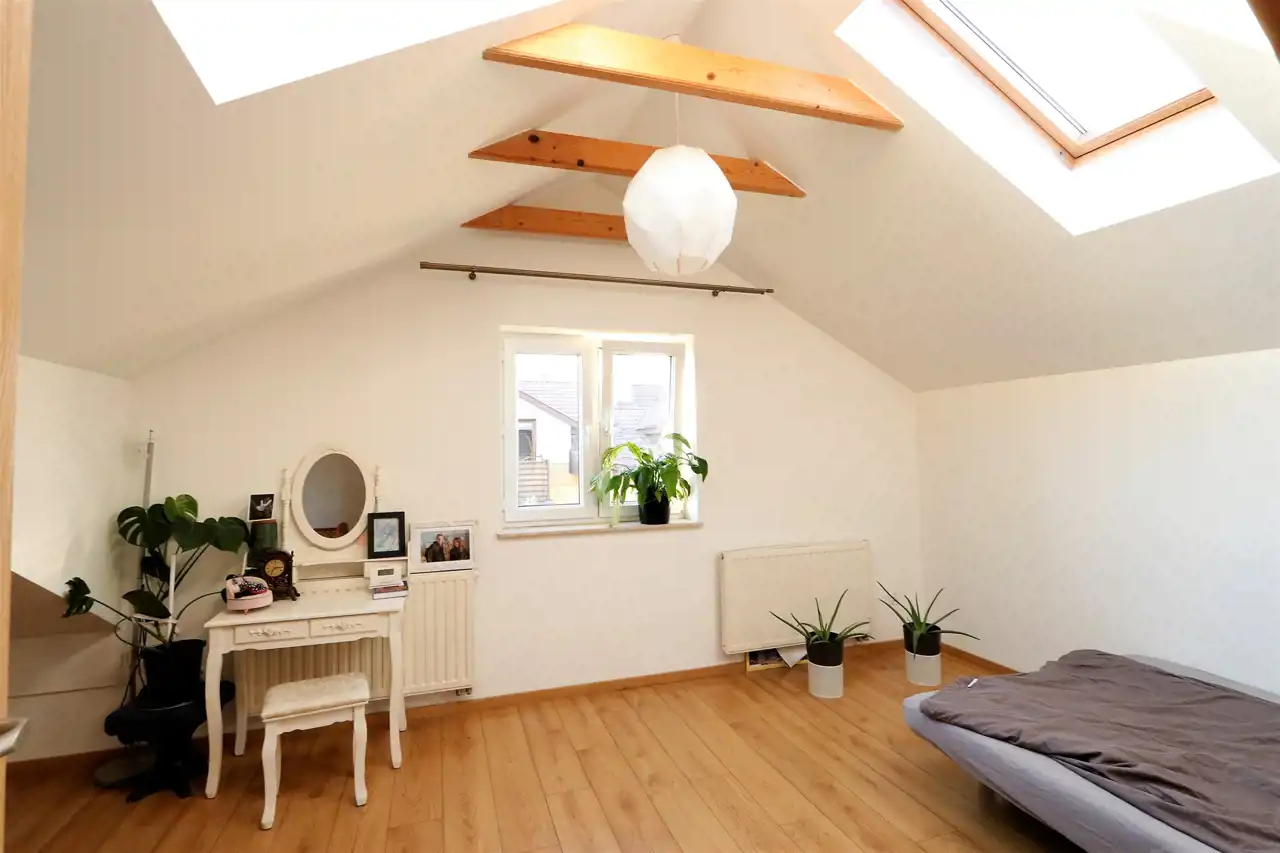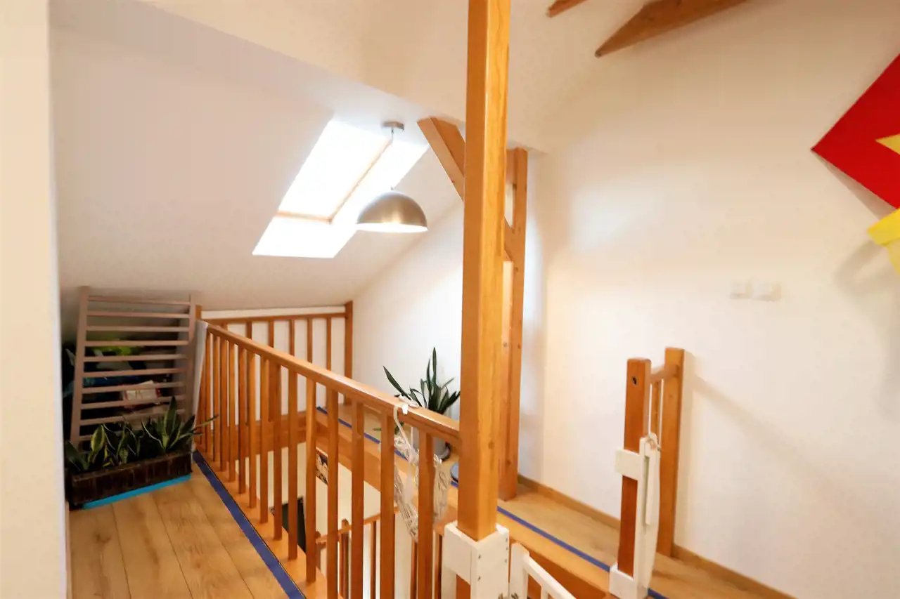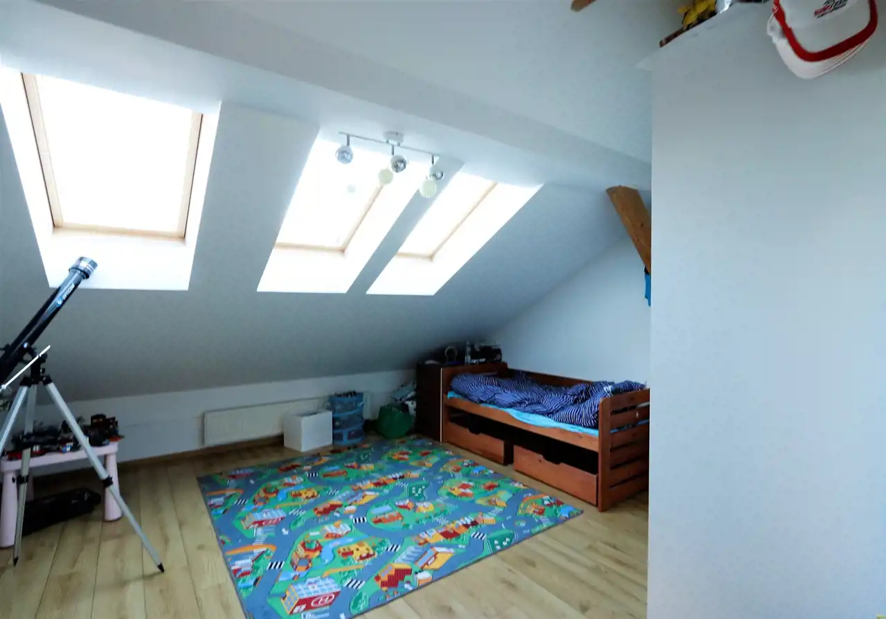 Na 2 poziom prowadzą szerokie, piękne schody dębowe. Na 2 poziomie znajduje się duży, przestronny korytarz i 3 pokoje oraz łazienka z prysznicem, toaletą i umywalką. W każdym pokoju - klimatyzacja.