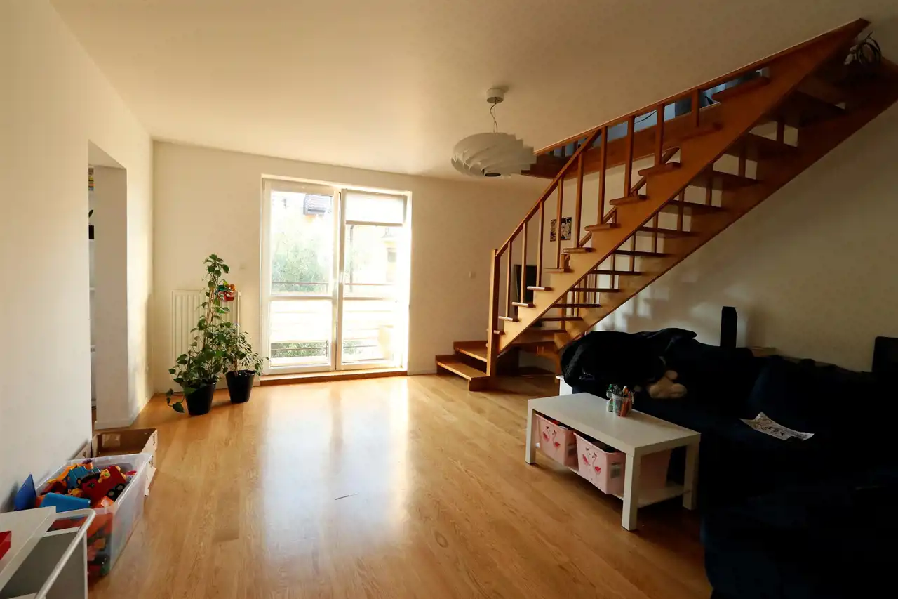 Na pierwszym poziomie znajduje się przedpokój z pojemną szafą, łazienka (z narożną wanną, pralką, suszarką do ubrań, umywalką i toaletą), piękny dodatkowy pokój z balkonem, jasna kuchnia z oknem oraz otwarty salon z balkonem.