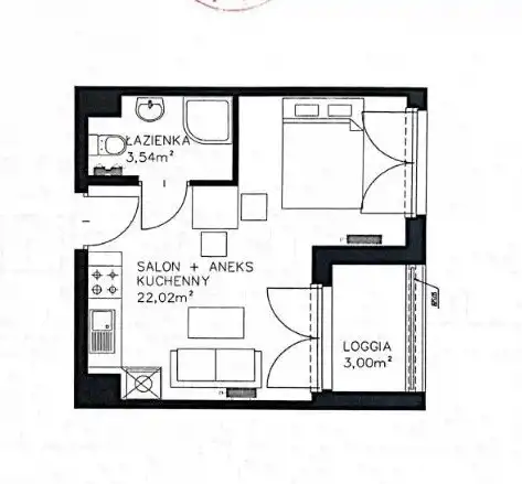 Oferuję Państwa mieszkanie 1-pokojowe o powierzchni 25,56 m2 z loggią w nowoczesnym budynku.