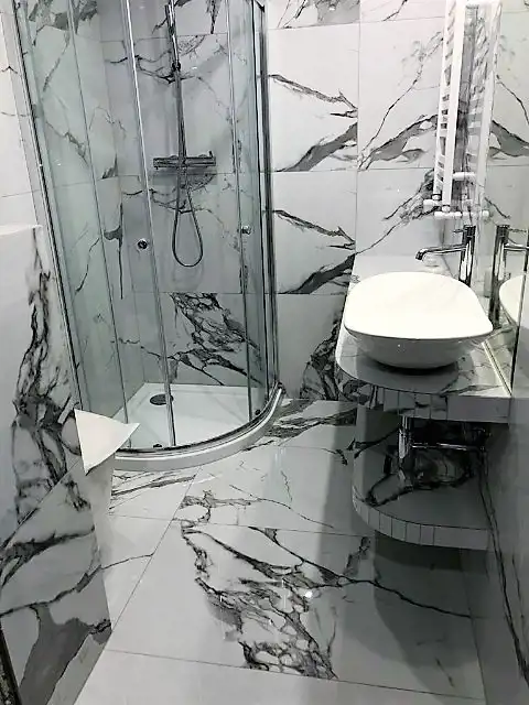 Przedpokój z szafą w zabudowie , oraz ładną elegancką łazienkę z kabiną prysznicową .