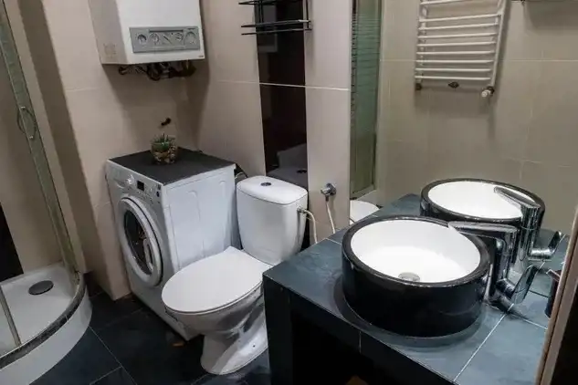 W łazience: pralka, piecyk, umywalka, muszla i kabina prysznicowa.