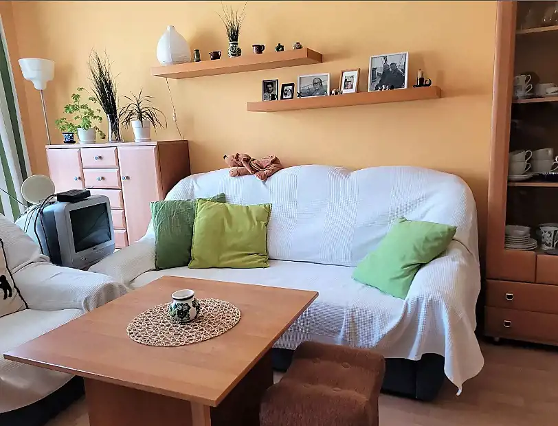 Sofa dwuosobowa rozkładana, duży fotel do kompletu, stolik kawowy, szafka najbliżej wejścia balkonowego z półkami i szufladami, nad sofą dwie półki, w rogu rodzaj meblościanki: szafka z drzwiami przeszklonymi i szufladami, szafka narożna i szafka z półkami; szafka pod telewizor, obok szafka z szufladami i szafa na ubrania.