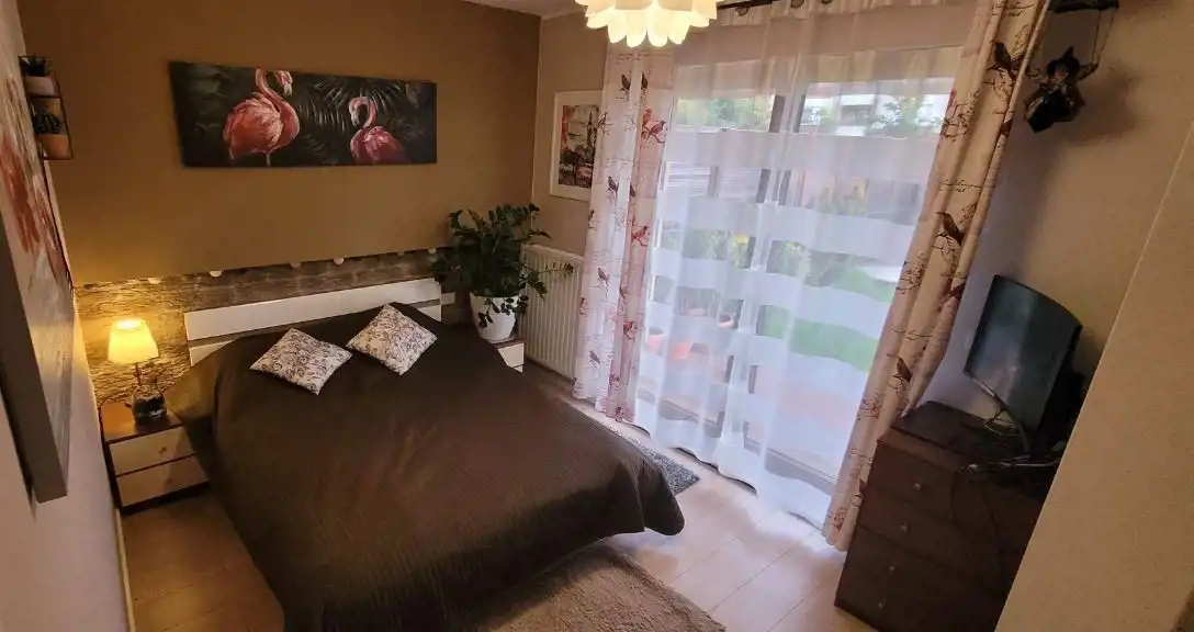 Mieszkanie o łącznej powierzchni 34,6m2 znajduje się na parterze budynku i składa się z salonu z aneksem kuchennym, sypialni, przedpokoju oraz łazienki oraz wc. Do wyłącznego użytku przez właściciela lokalu wyposażony 70m2 ogródek. Osiedle jest ogrodzone i monitorowane.
