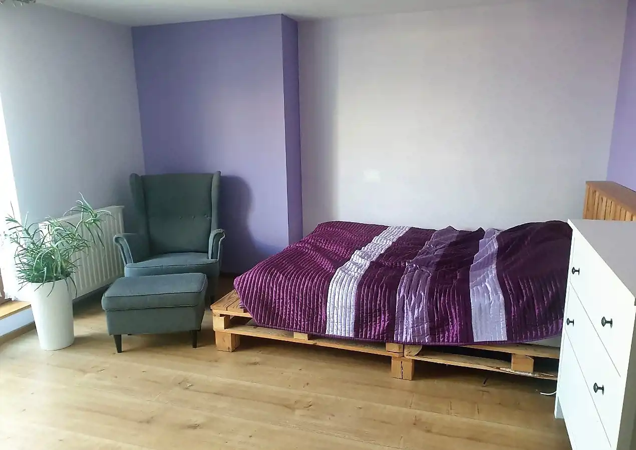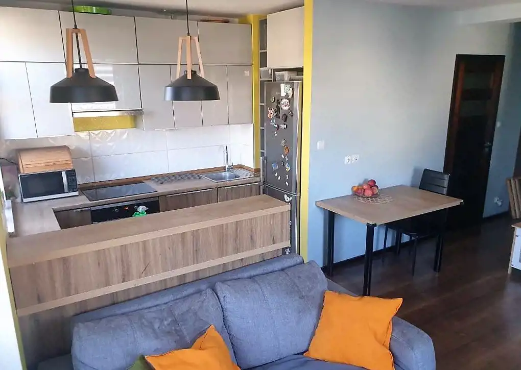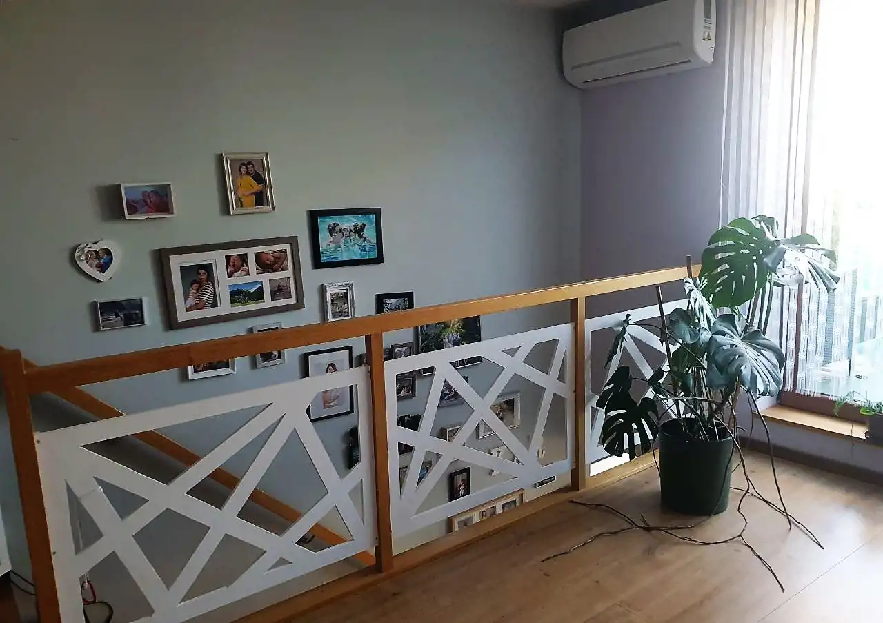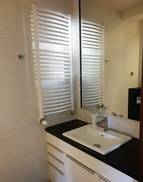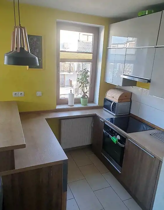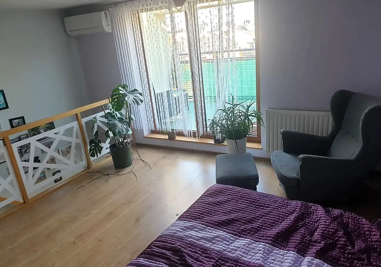 Narożne, ustawienie wschodnie bardzo ładnie doświetlone. Na dole duży balkon w kształcie litery L, na górze duży taras. Na dolnym poziomie znajduje się przedpokój, łazienka, sypialnia, salon z aneksem. Na górnym poziomie jest sypialnia z garderobą. Mieszkanie wyposażone w kuchenną zabudowę ze sprzętami, możliwość zostawienia regałów lub innych mebli. Zamontowana klimatyzacja (2020) w takim miejscu aby chłodziła oba poziomy jednocześnie.