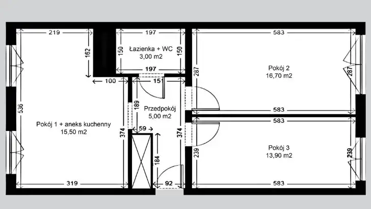 Mieszkanie składa się z Salonu z aneksem kuchennym (ok. 16 m2), dwóch Pokoi (ok. 17 m2 i ok. 14 m2), Łazienki z wanną i WC (ok 3,0 m2) i dużego Przedpokoju (ok 5,6 m2)